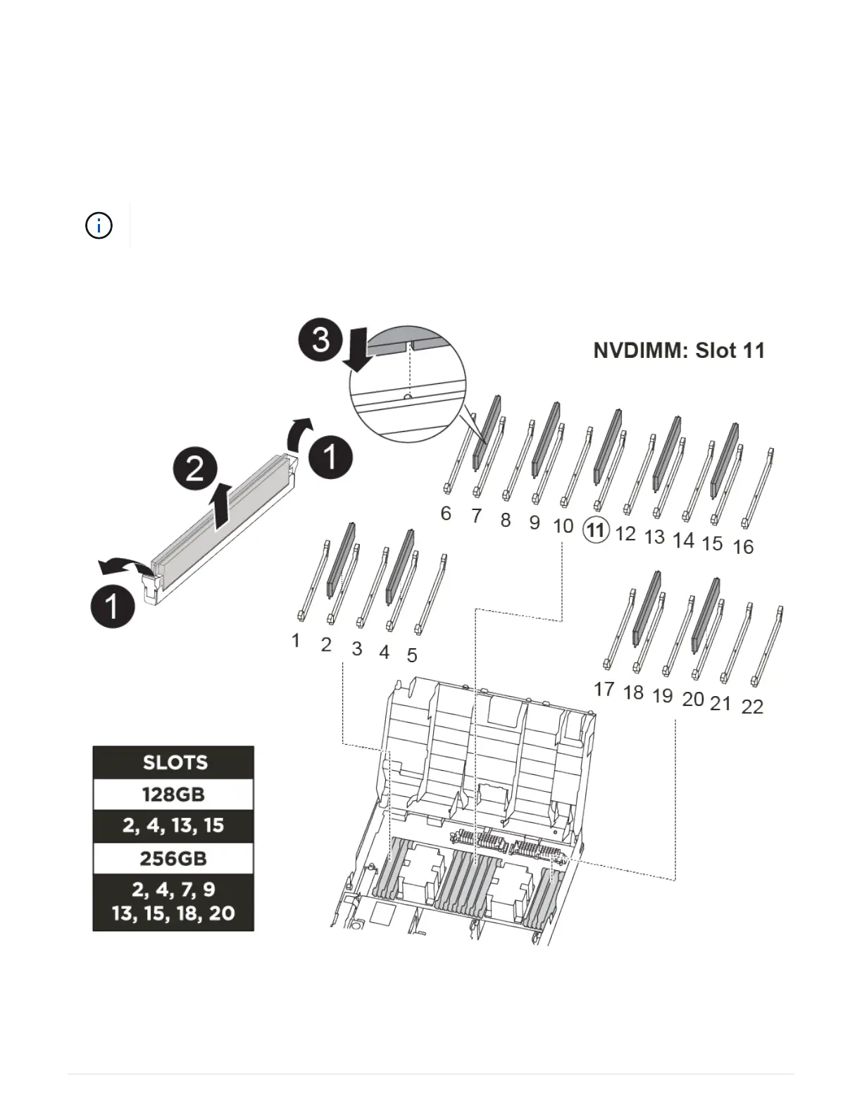 The DIMMs are located in sockets 2, 4, 13, and 15. The NVDIMM is located in slot 11.