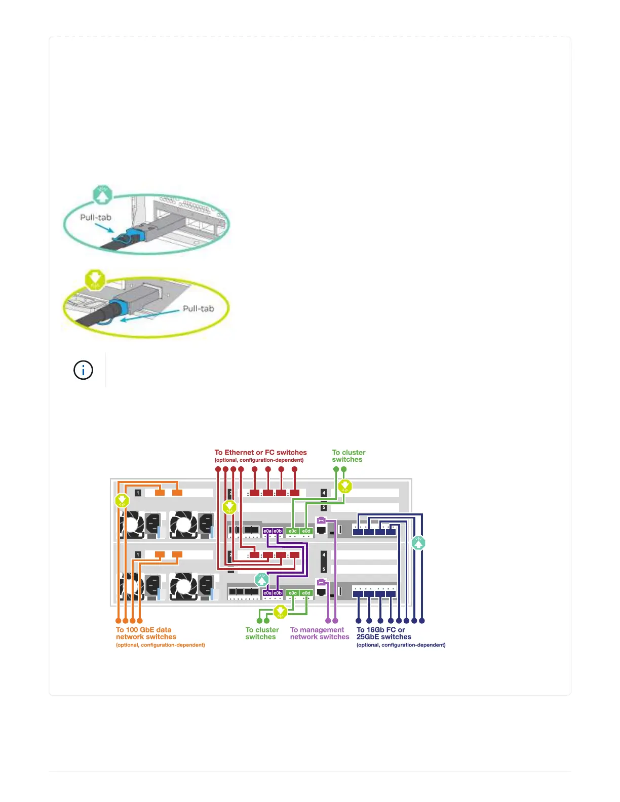 Controller module cluster interconnect and HA ports are cabled to the cluster/HA switch. The optional