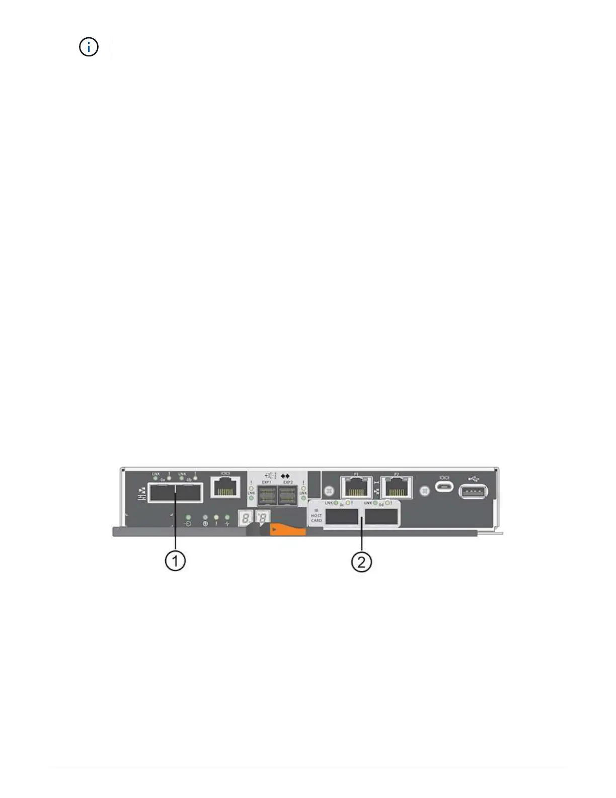 The following figure shows the E5700 with its SFP+ (optical) baseboard host ports (1) and the optional two IB