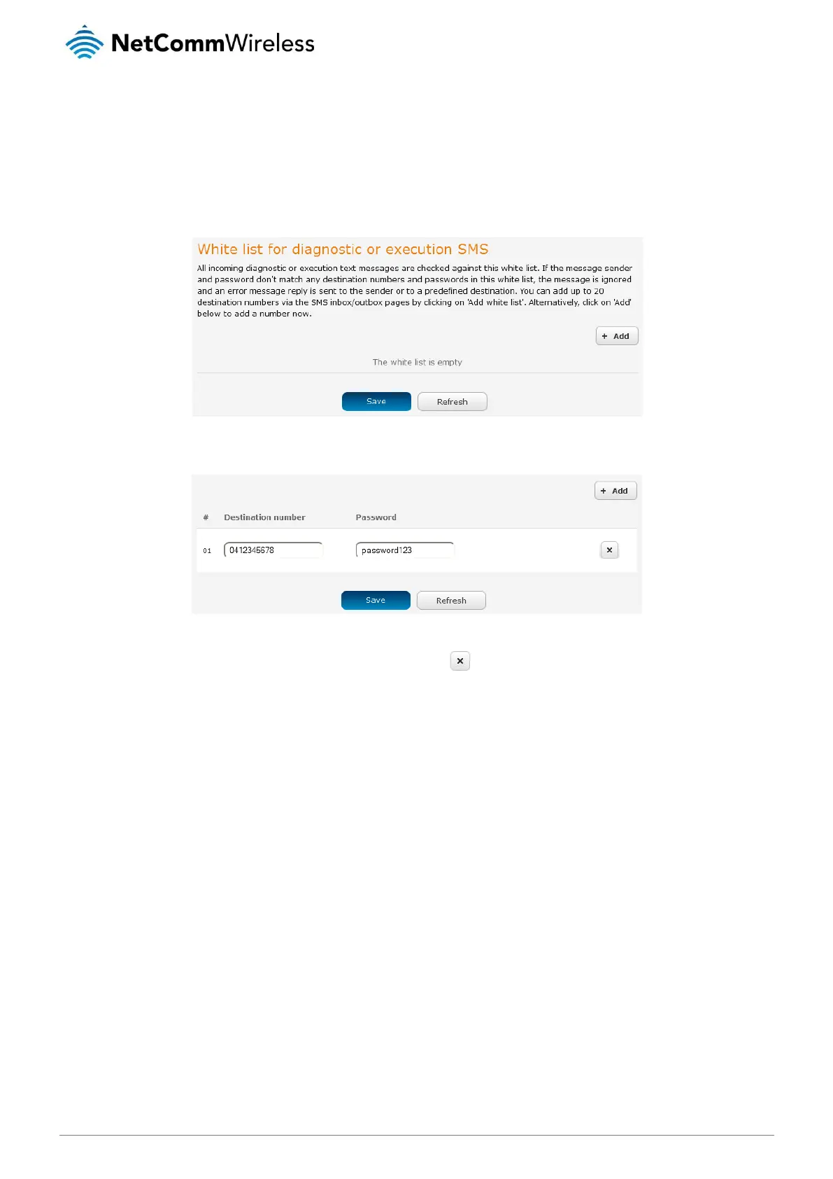 A maximum of 20 numbers can be stored on the router in the white list. To add a number to the white list, click the “+Add” button.