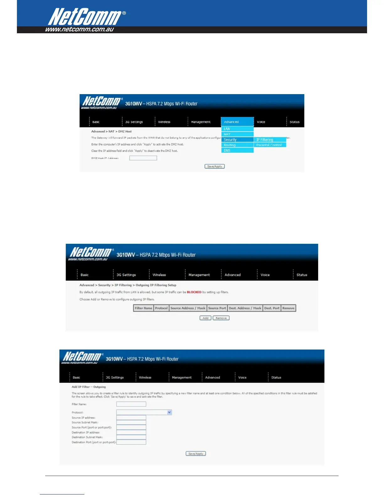The IP Filtering screen sets filter rules that limit incoming and outgoing IP traffic. Multiple filter rules can be set
