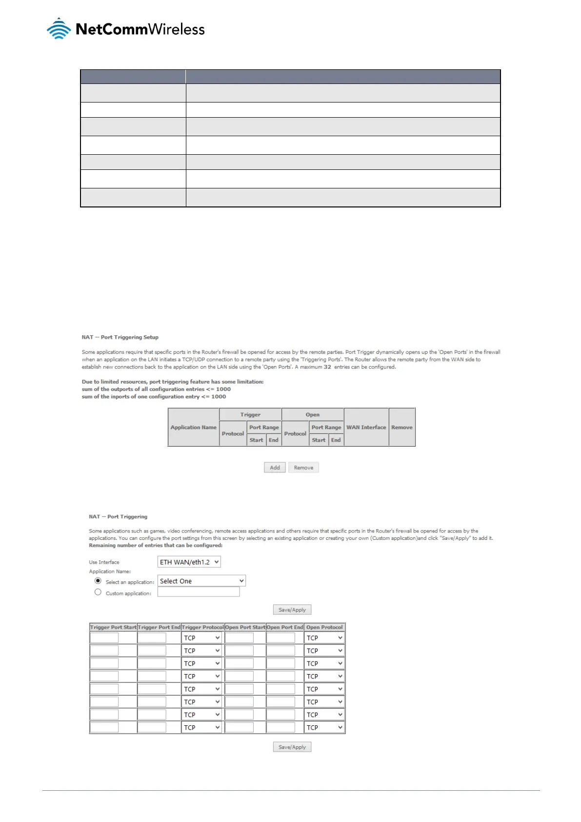 Some applications require specific ports in the Router’s firewall to be open for access by remote parties. Port Triggering opens up