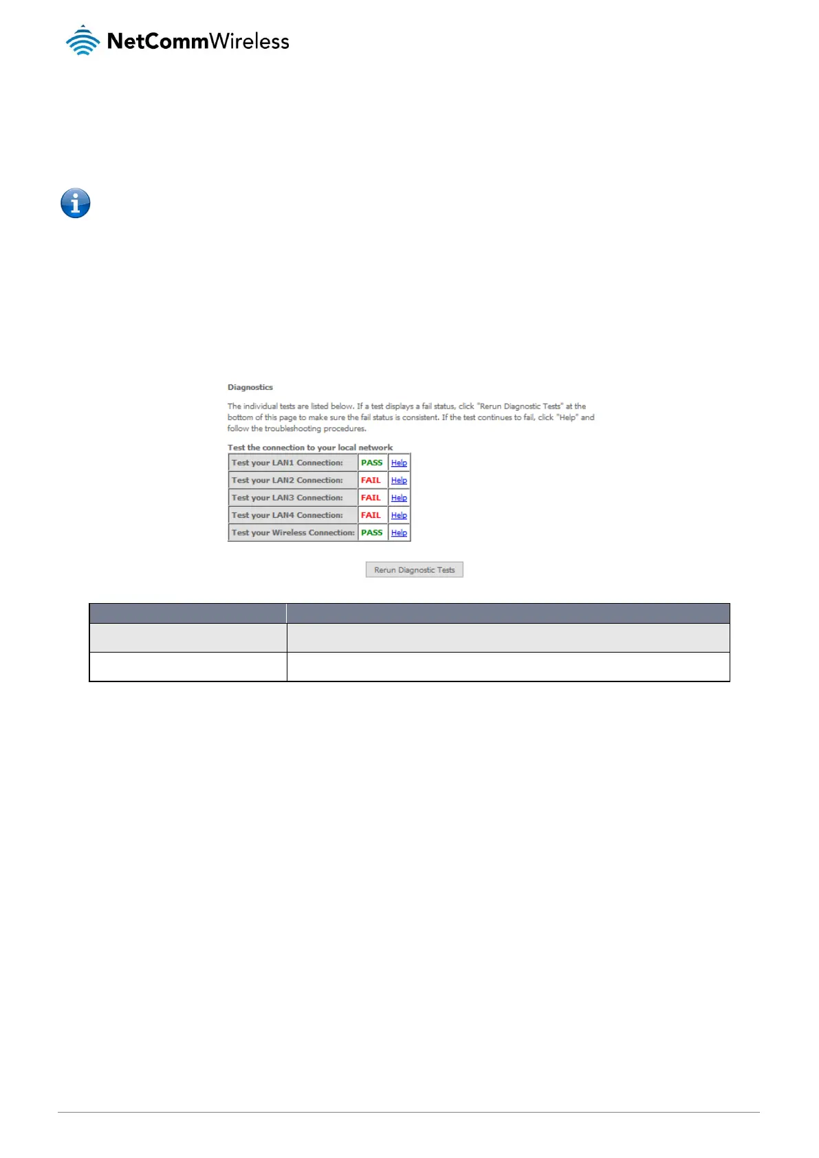 The Diagnostics menu provides feedback on the connection status of the device. The individual tests are listed below. If a test