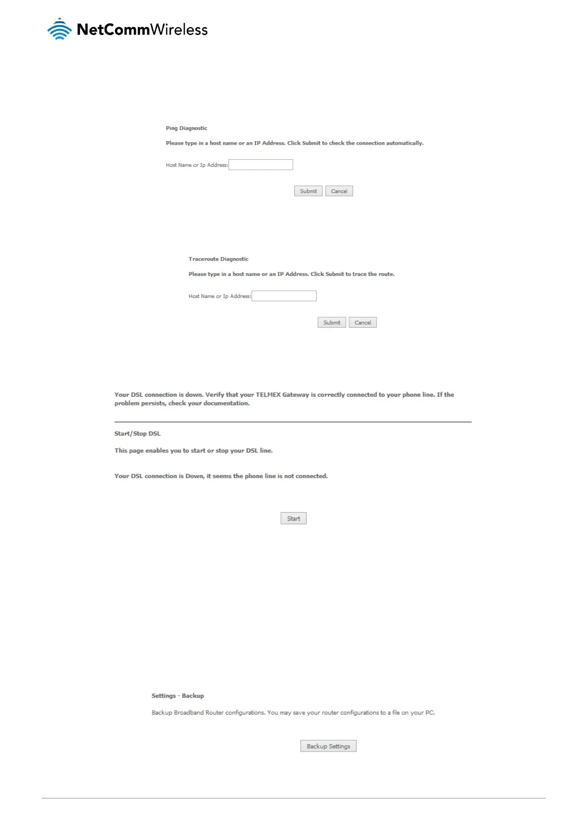 This page lets you stop or start the DSL service for troubleshooting purposes.