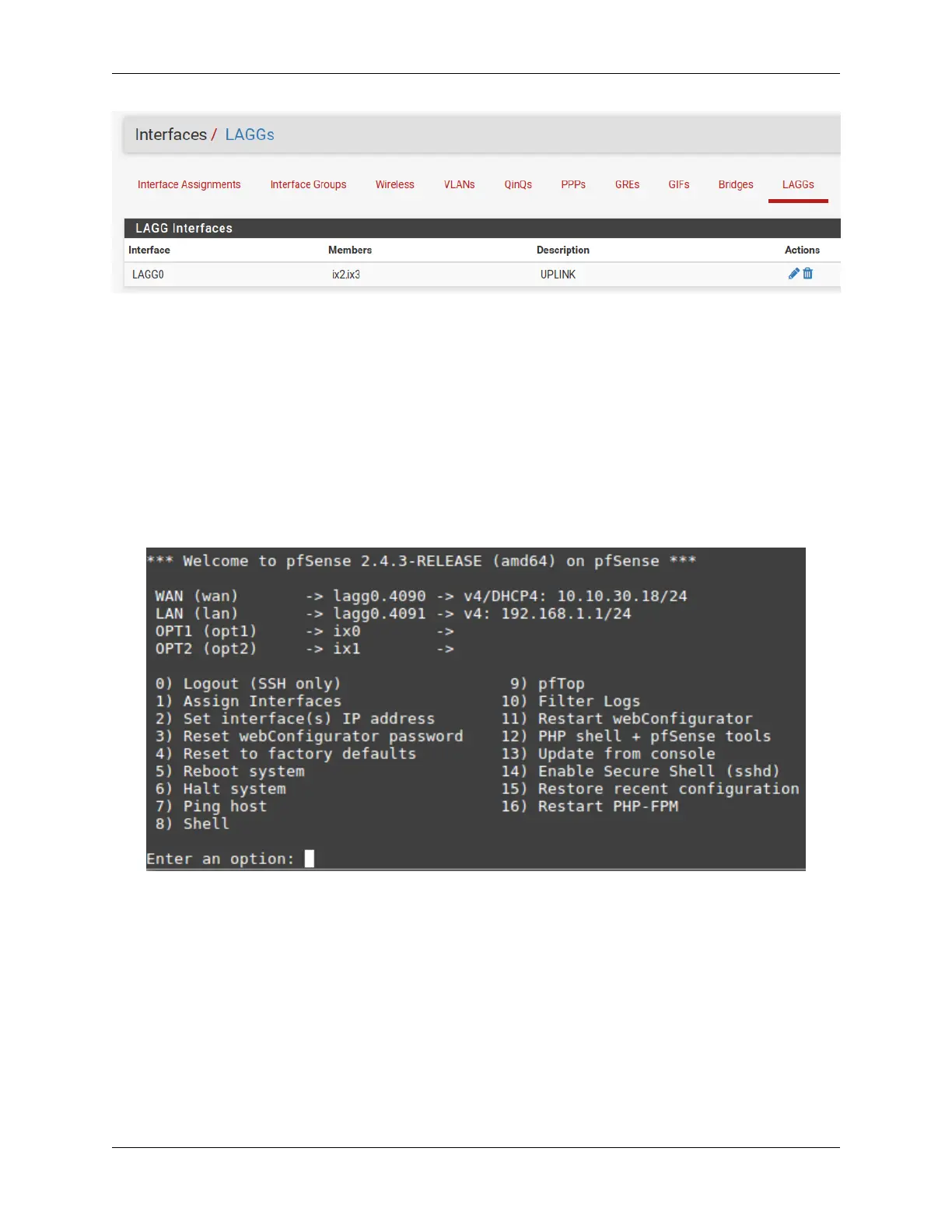 In this example, ix0 is the WAN, so select option 1 to re-assign WAN from lagg0.4090 to ix0:
