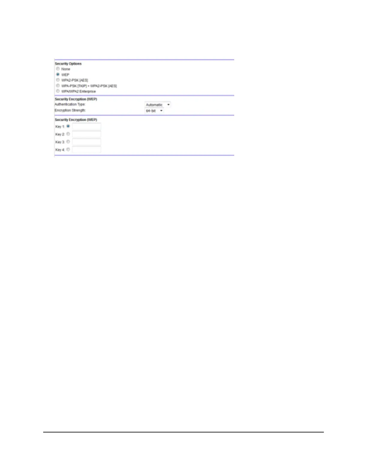 • 128-bit. Standard WEP encryption, using 104/128-bit encryption. This selection