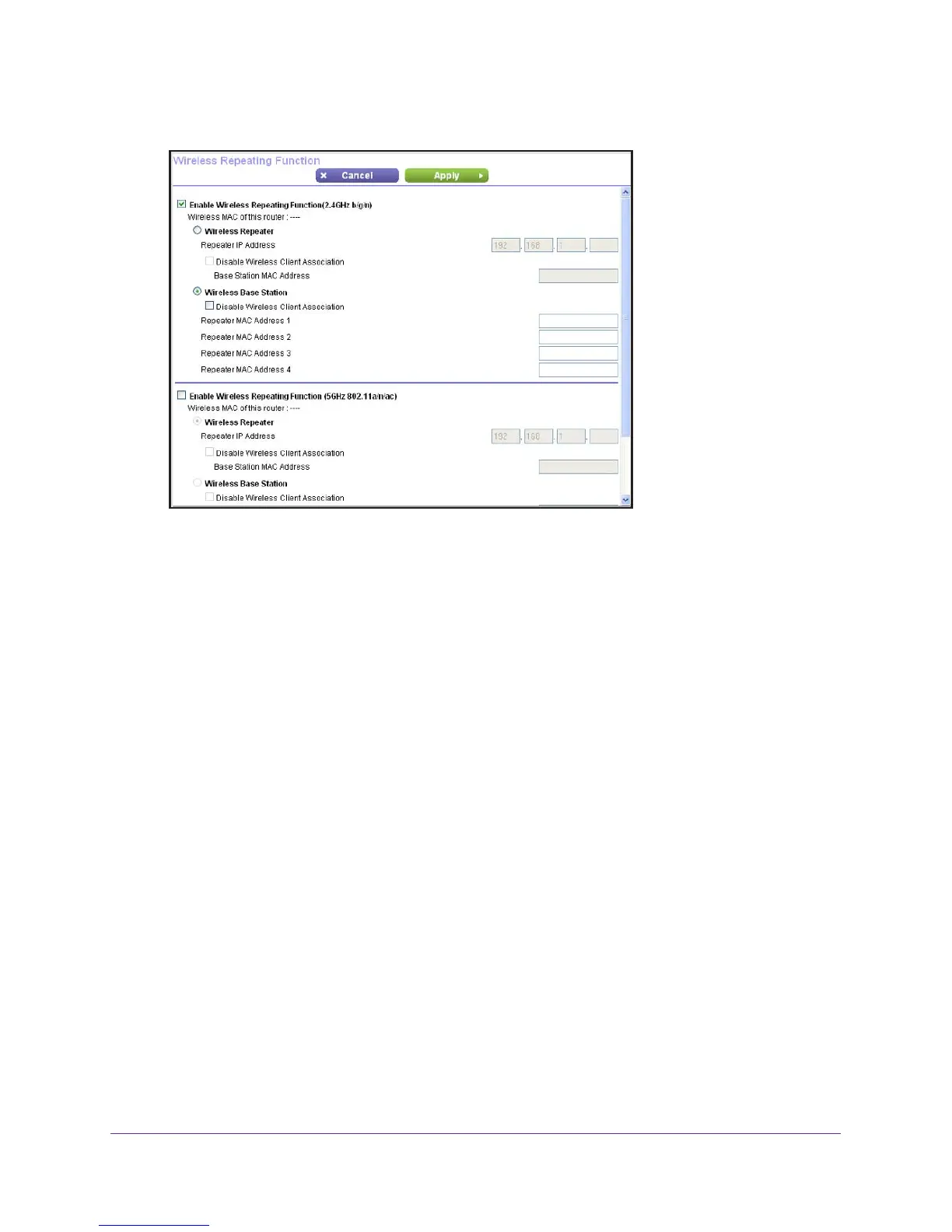 6. In the Repeater MAC Address 1 through 4 fields, enter the MAC addresses for the access
