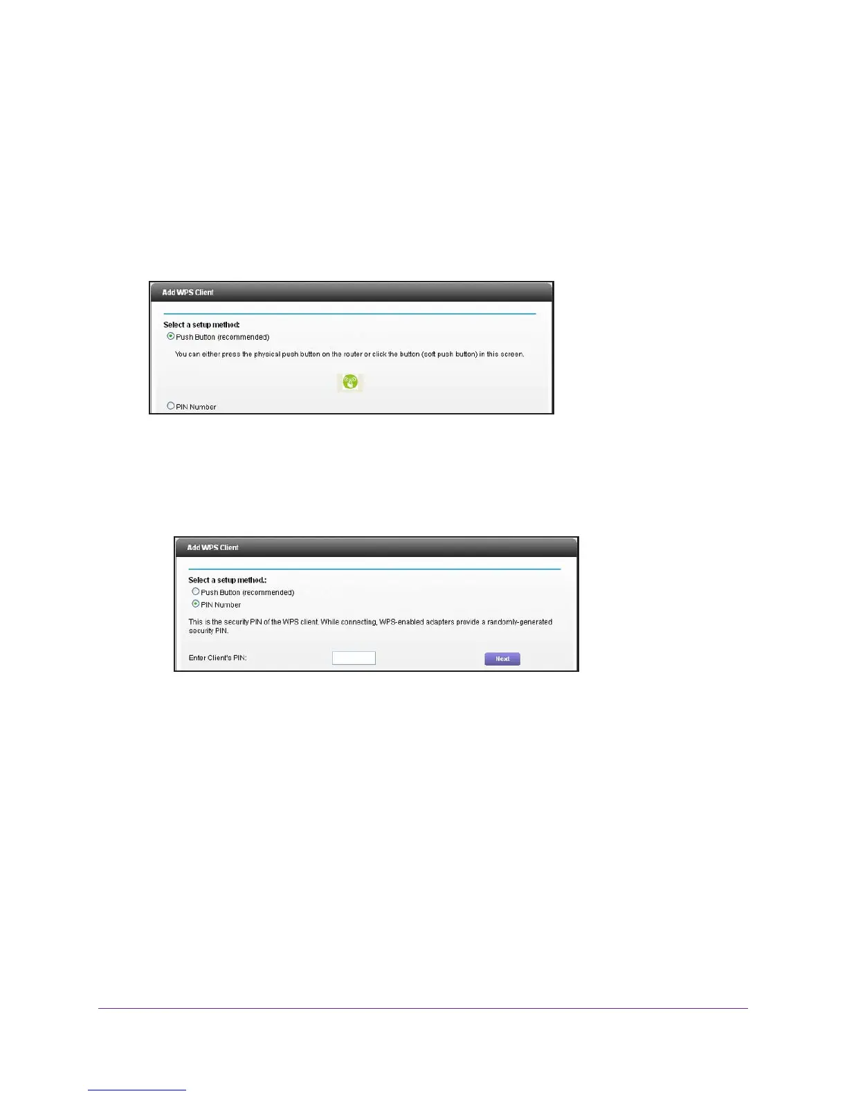• Push button. Either click the WPS button on this screen, or press the WPS button on
