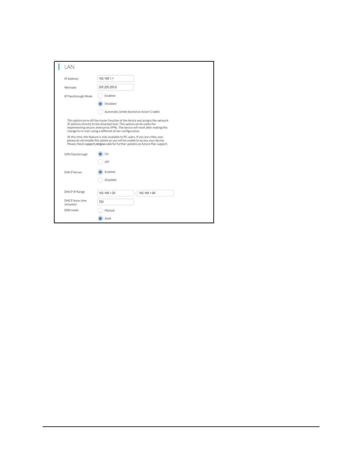 5. In the LAN section, select the IP Passthrough Mode Enabled radio button.
