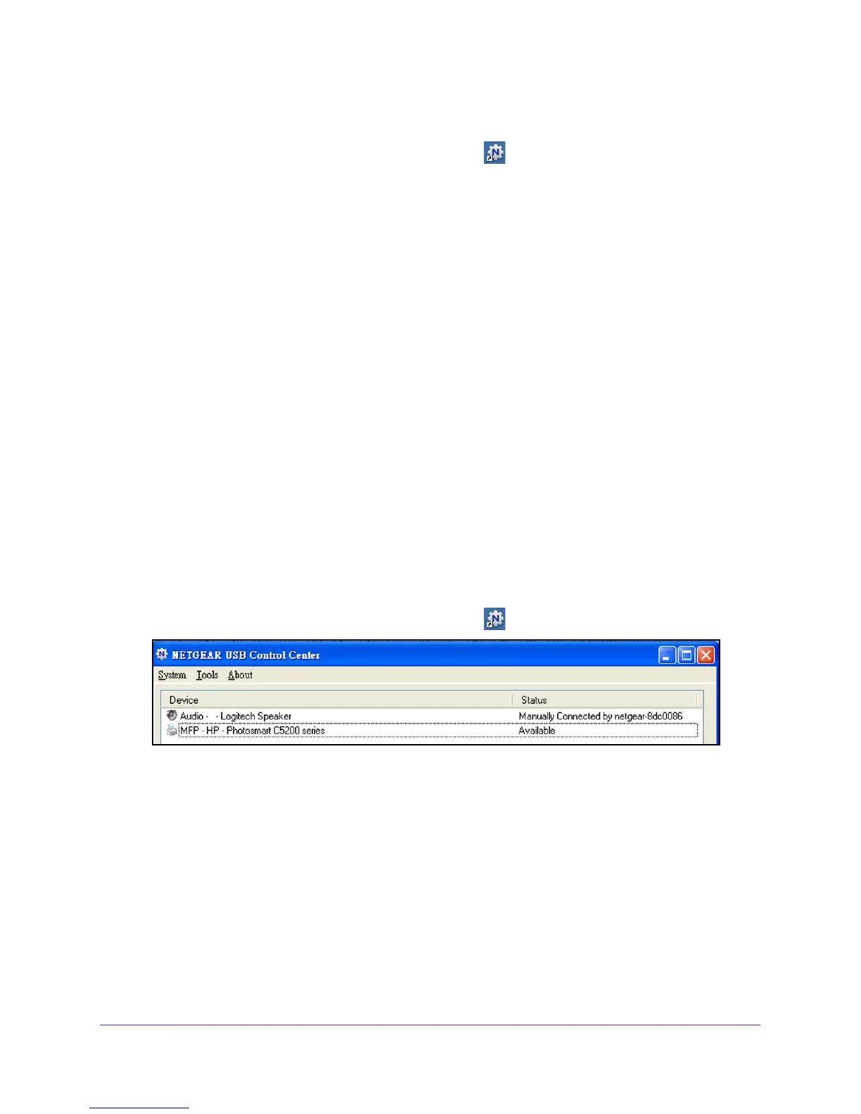 The NETGEAR USB Control Center automatically connects your computer to the USB