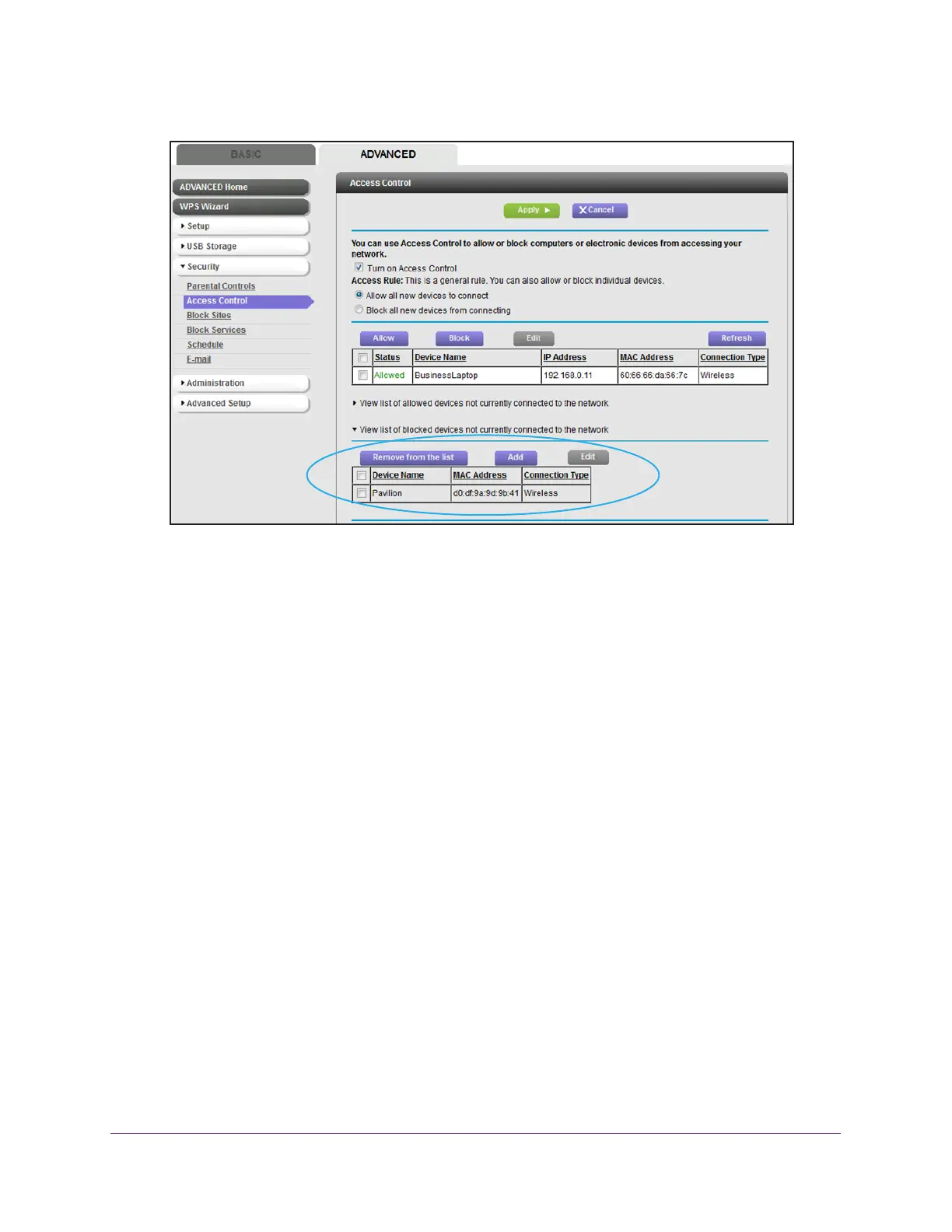 For a device on the blocked list, whether or not currently connected to the network, you can