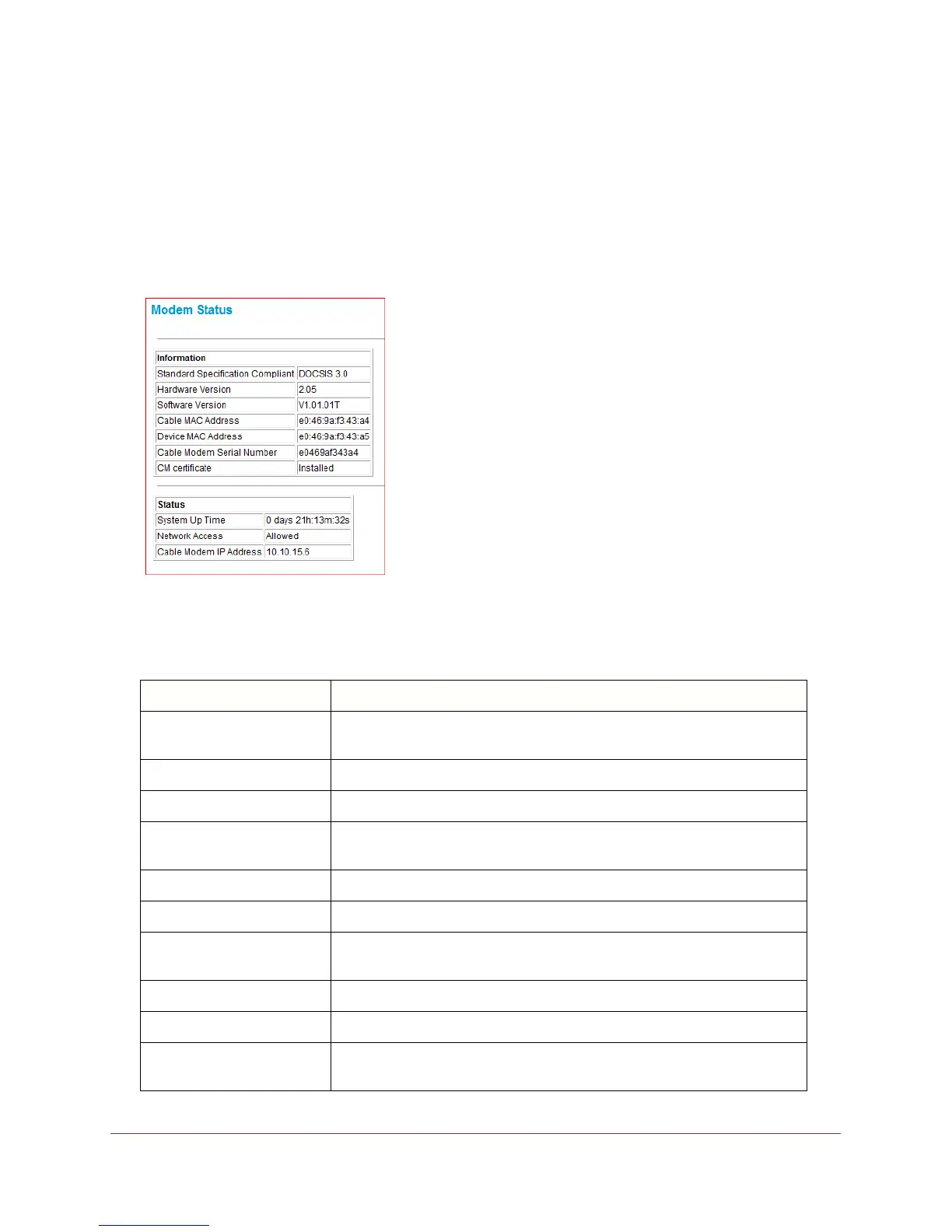 Cable MAC Address The MAC address used by the cable modem port of the gateway. This MAC