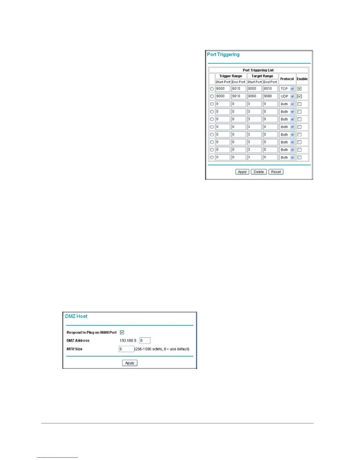 • To remove a port trigger, select its radio button, and click Delete.