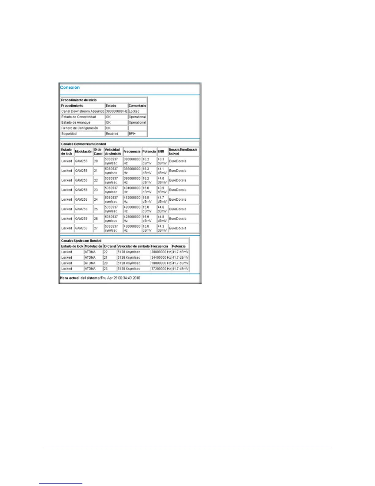 about the downstream and upstream cable channel. The time is displayed after the gateway