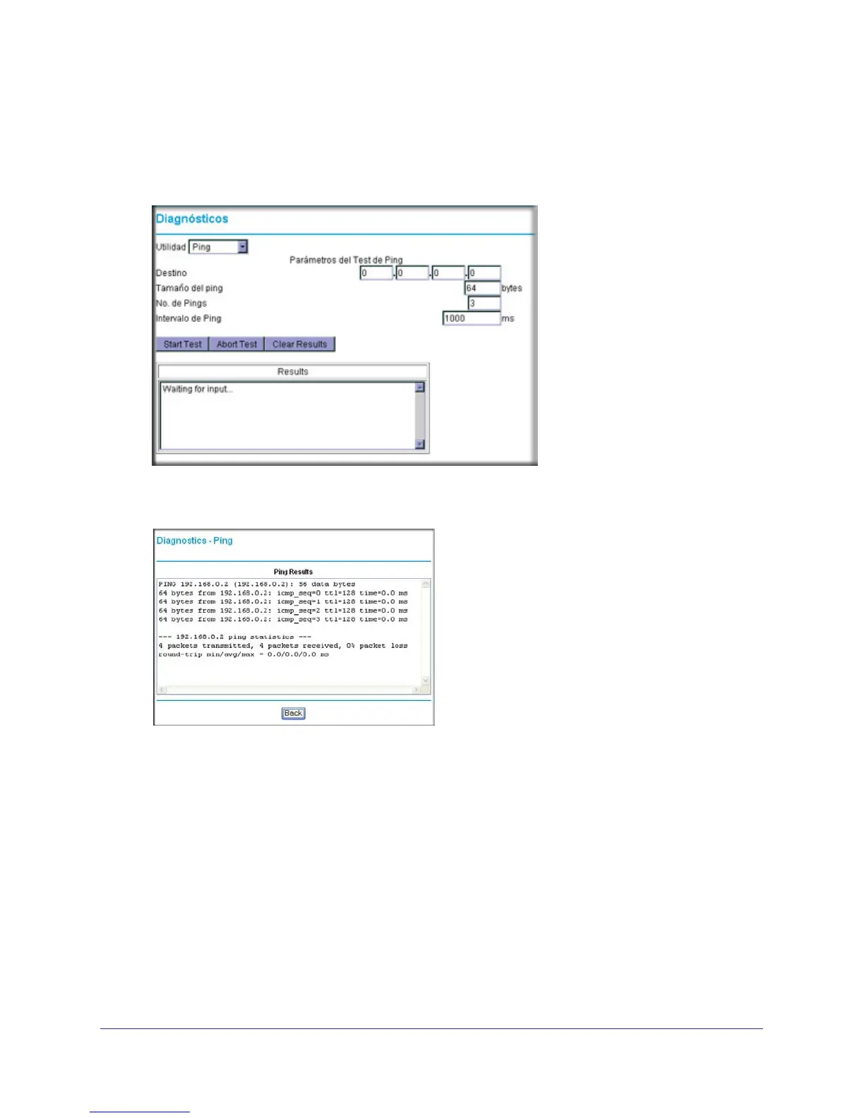 3. To start a ping test, enter the IP address in the Diagnostics screen, and click the Ping