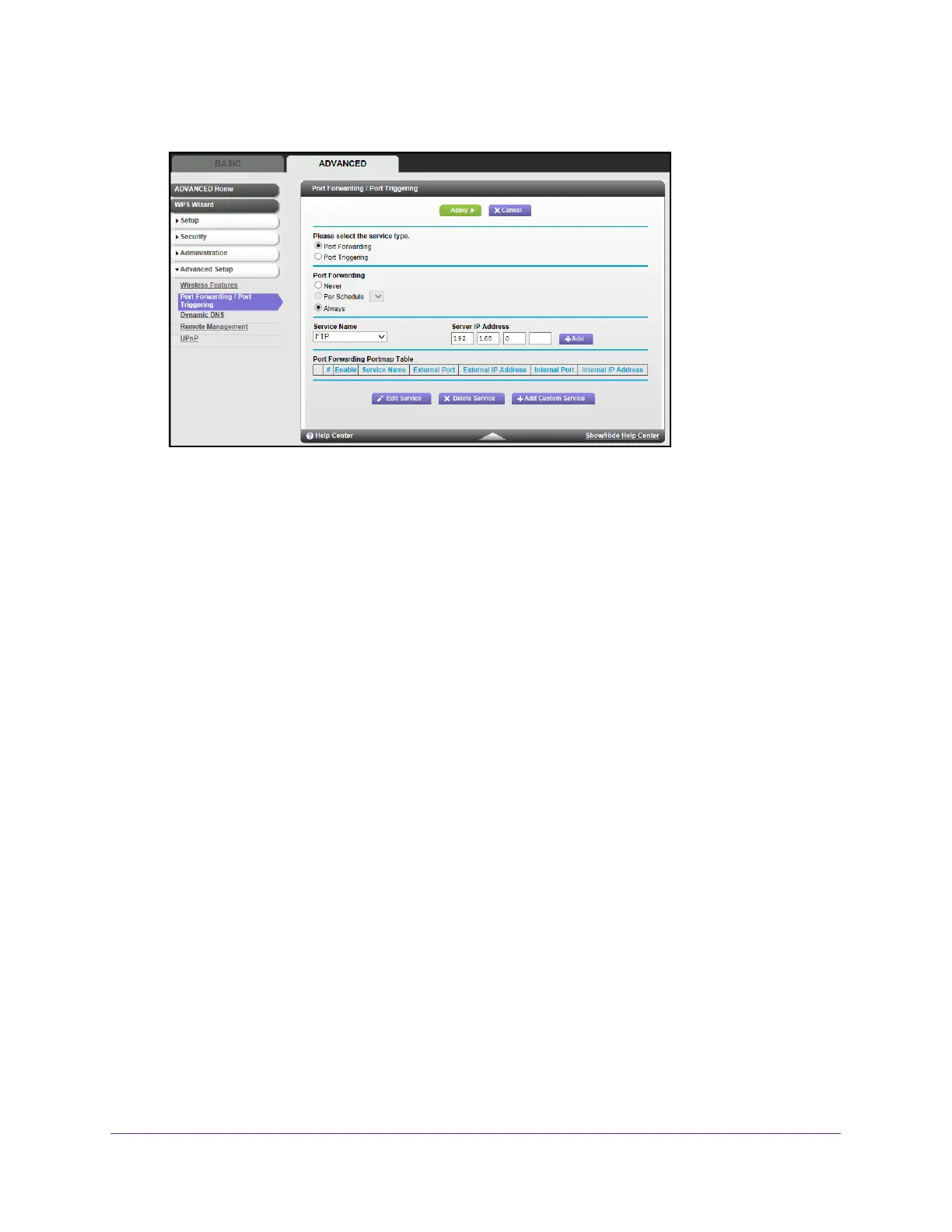 ANCED > Advanced Setup > Port Forwarding/Port Triggering.