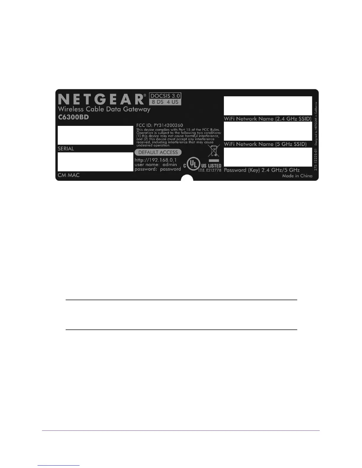 The label on side panel of the cable data gateway shows the login information, MAC address,