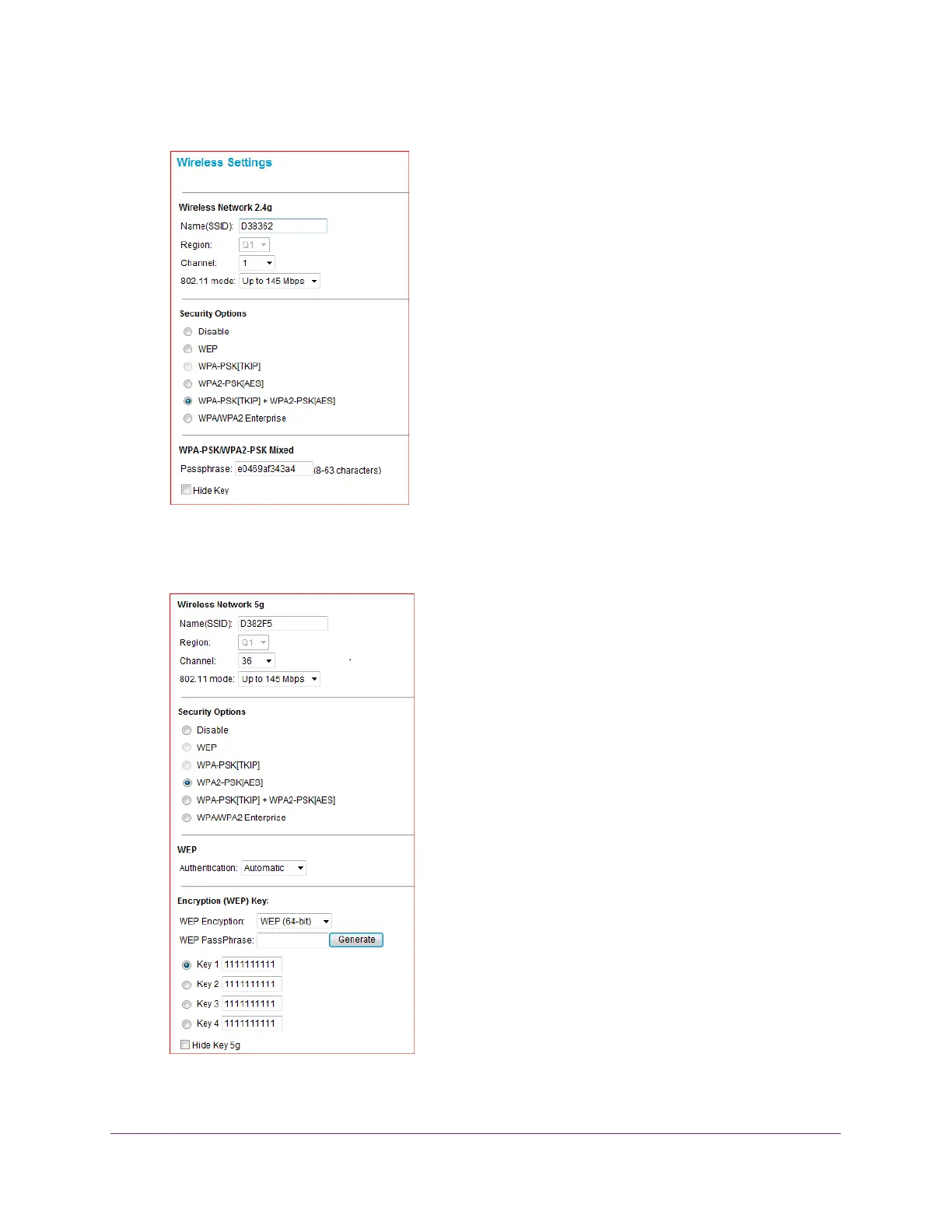 The lower portion of the Wireless Settings screen displays settings for the 5 GHz