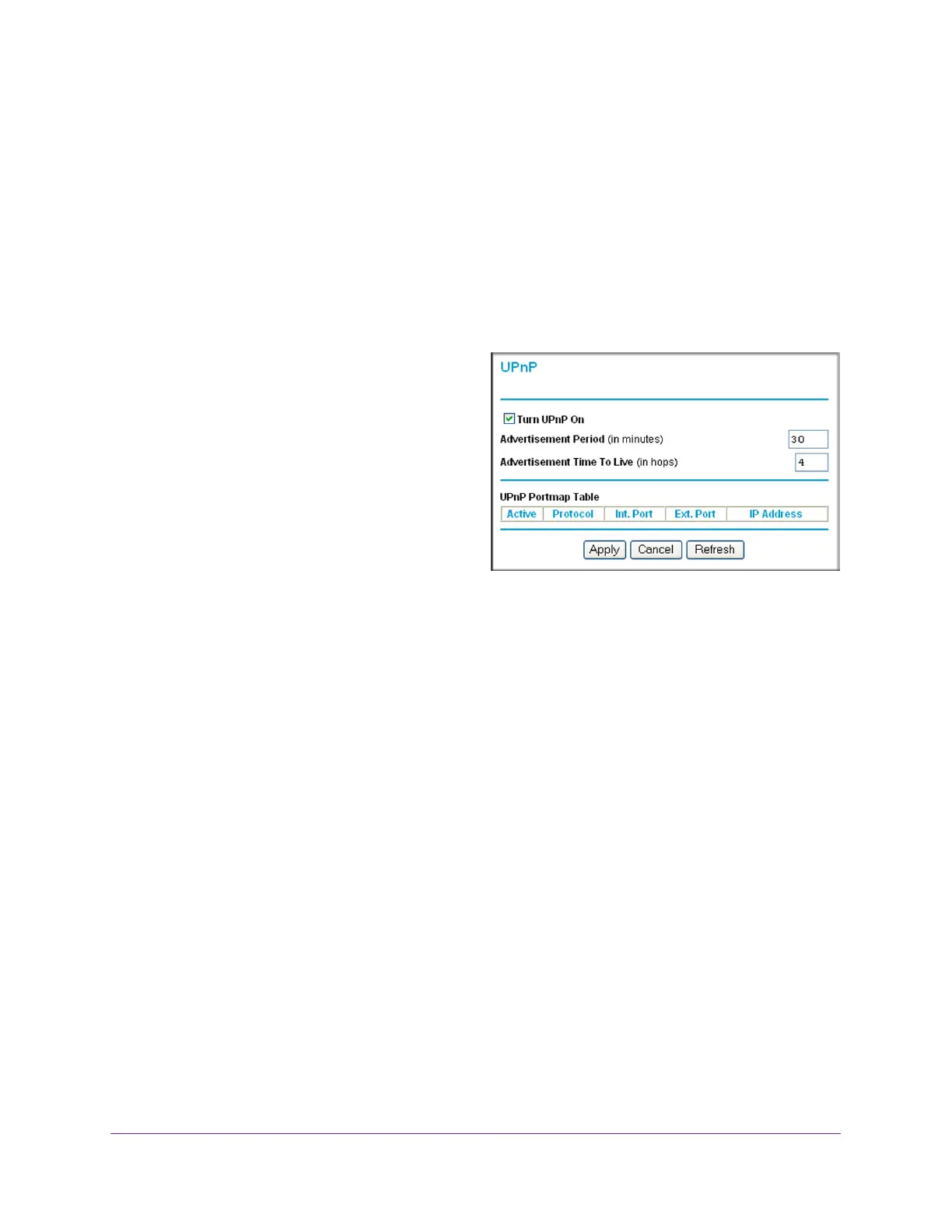 • Click Refresh to update the UPnP Portmap Table and to show the active ports that