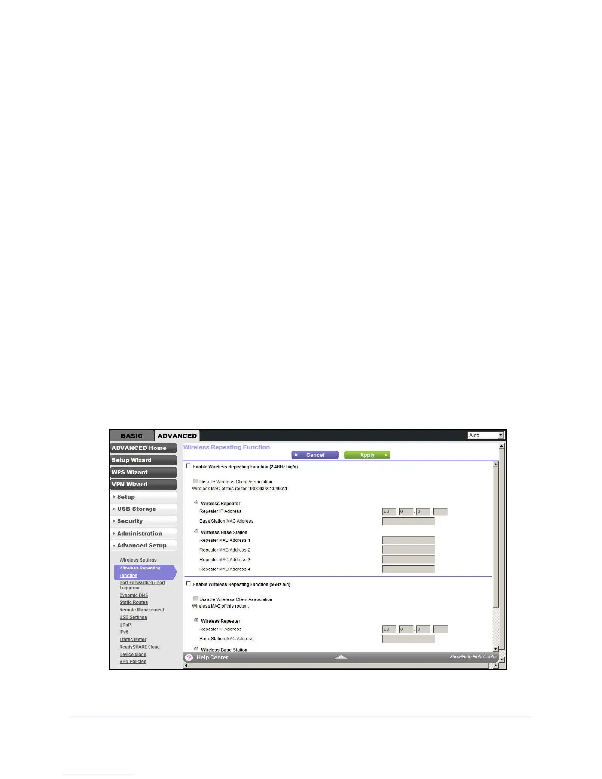 Use the Wireless Repeating Function screen to view or change the wireless repeater