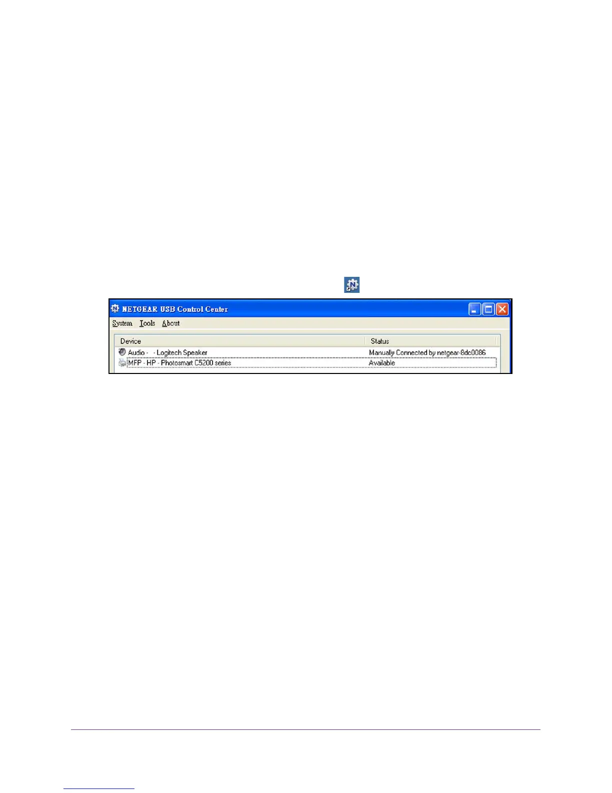 The NETGEAR USB Control Center automatically connects your computer to the USB