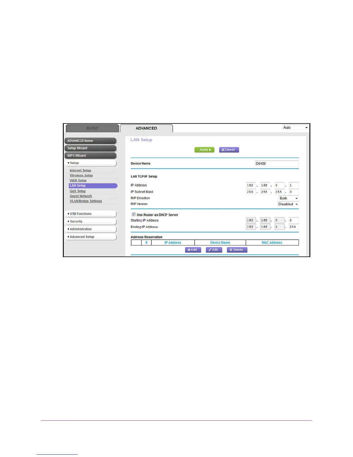 5. Select ADVANCED > Setup > LAN Setup.