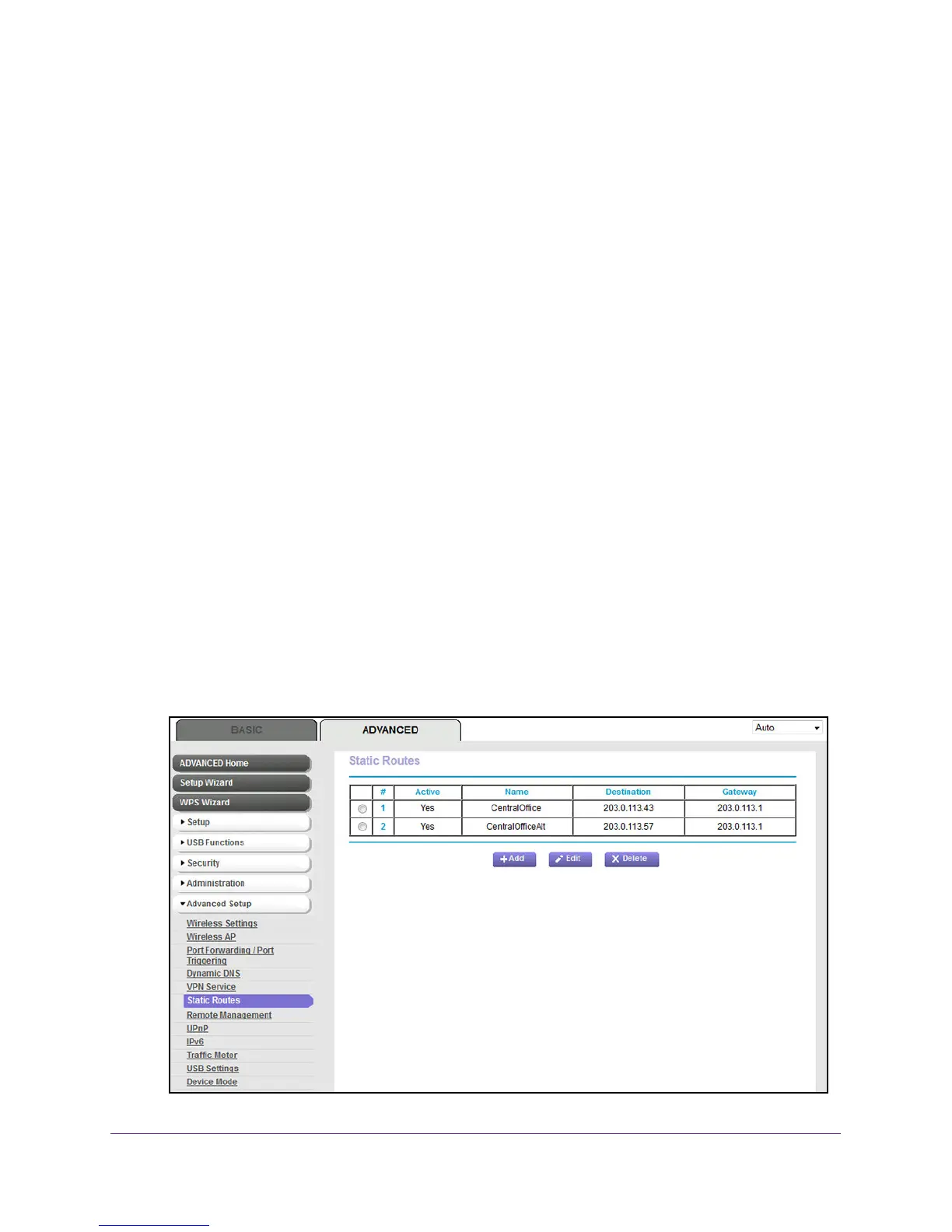 5. Select ADVANCED > Advanced Setup > Static Routes