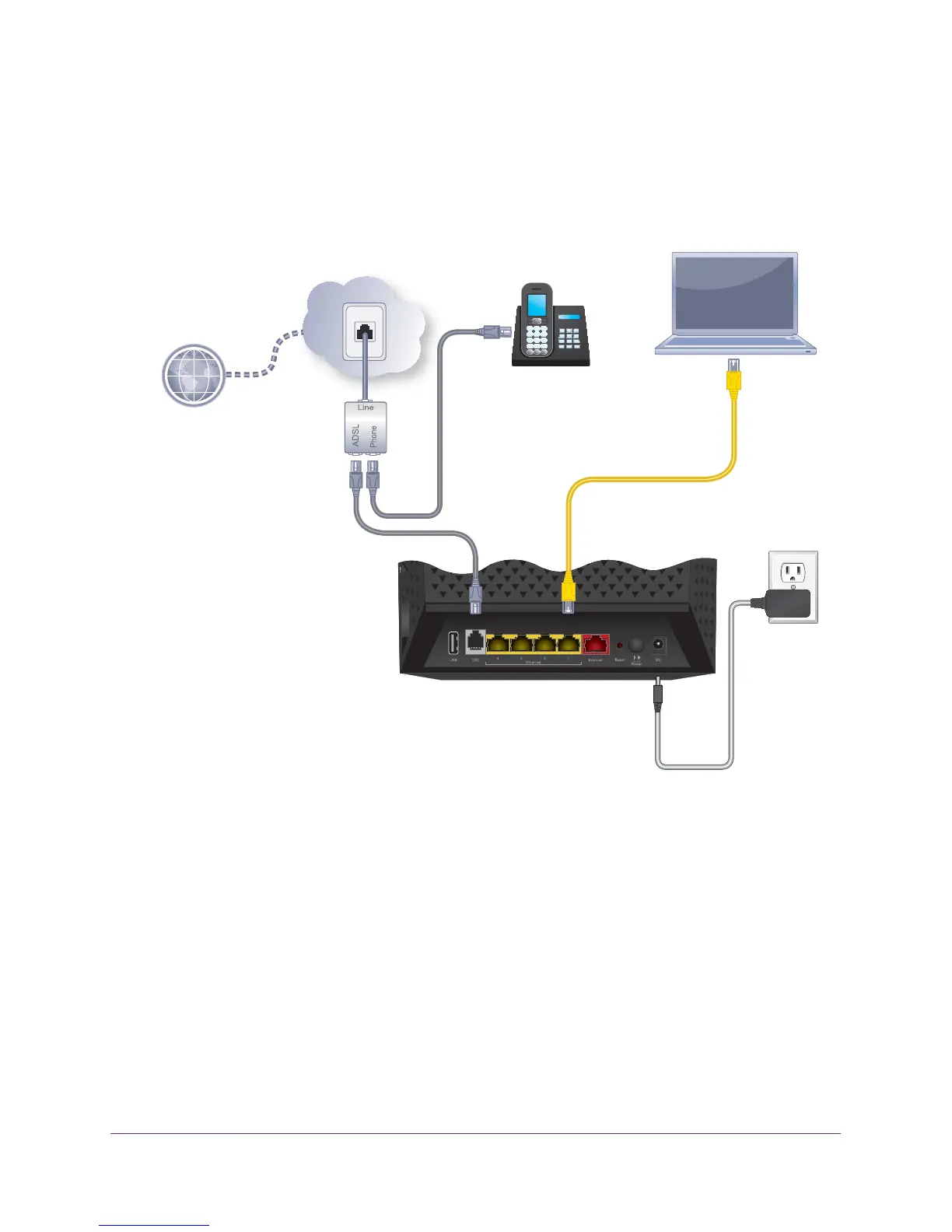 The following figure shows the cabling of your modem router for DSL service.