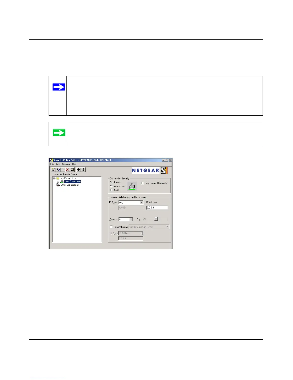 • From the Edit menu of the Security Policy Editor, click Add, then Connection. A “New