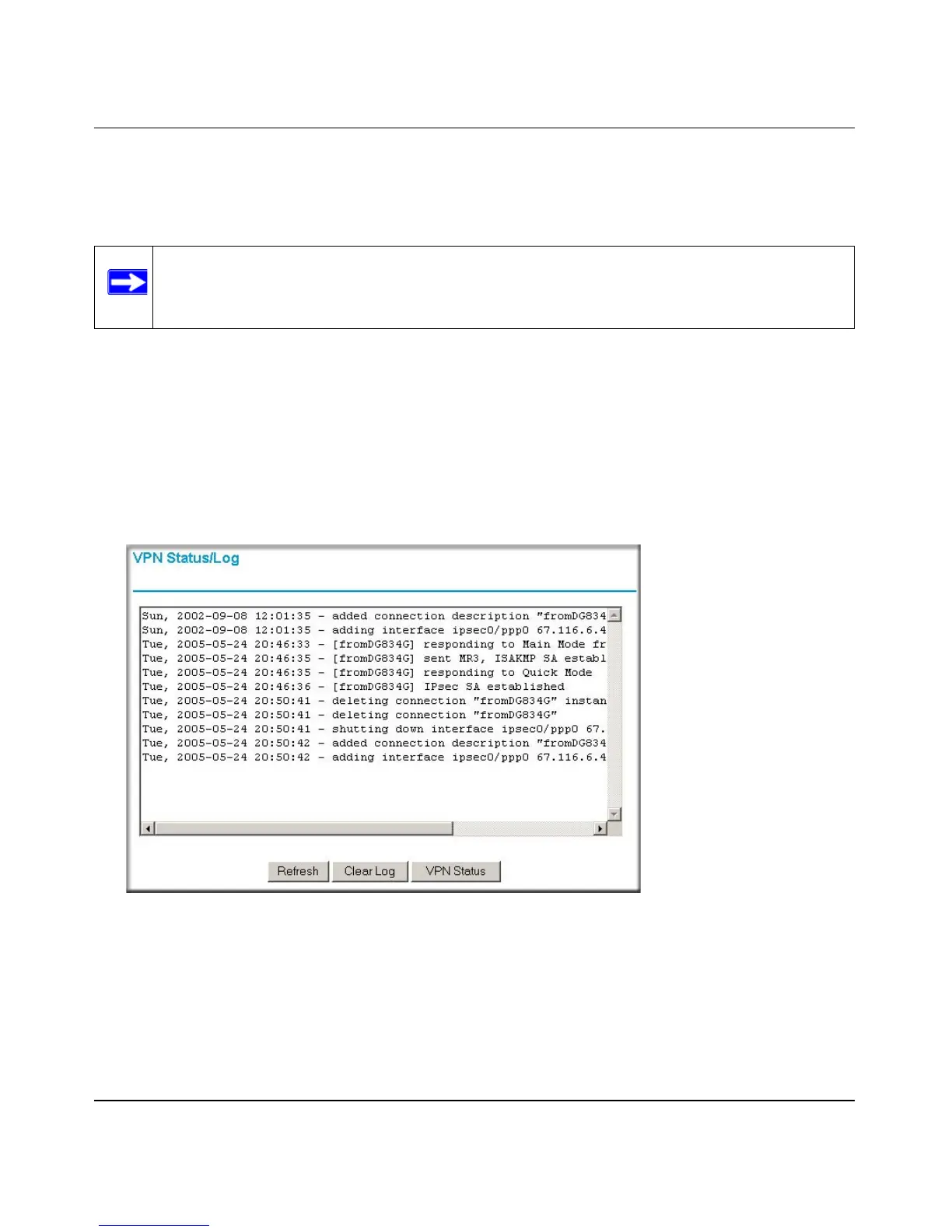 the VPN Status button. The VPN Status/Log screen for a connection is shown below: