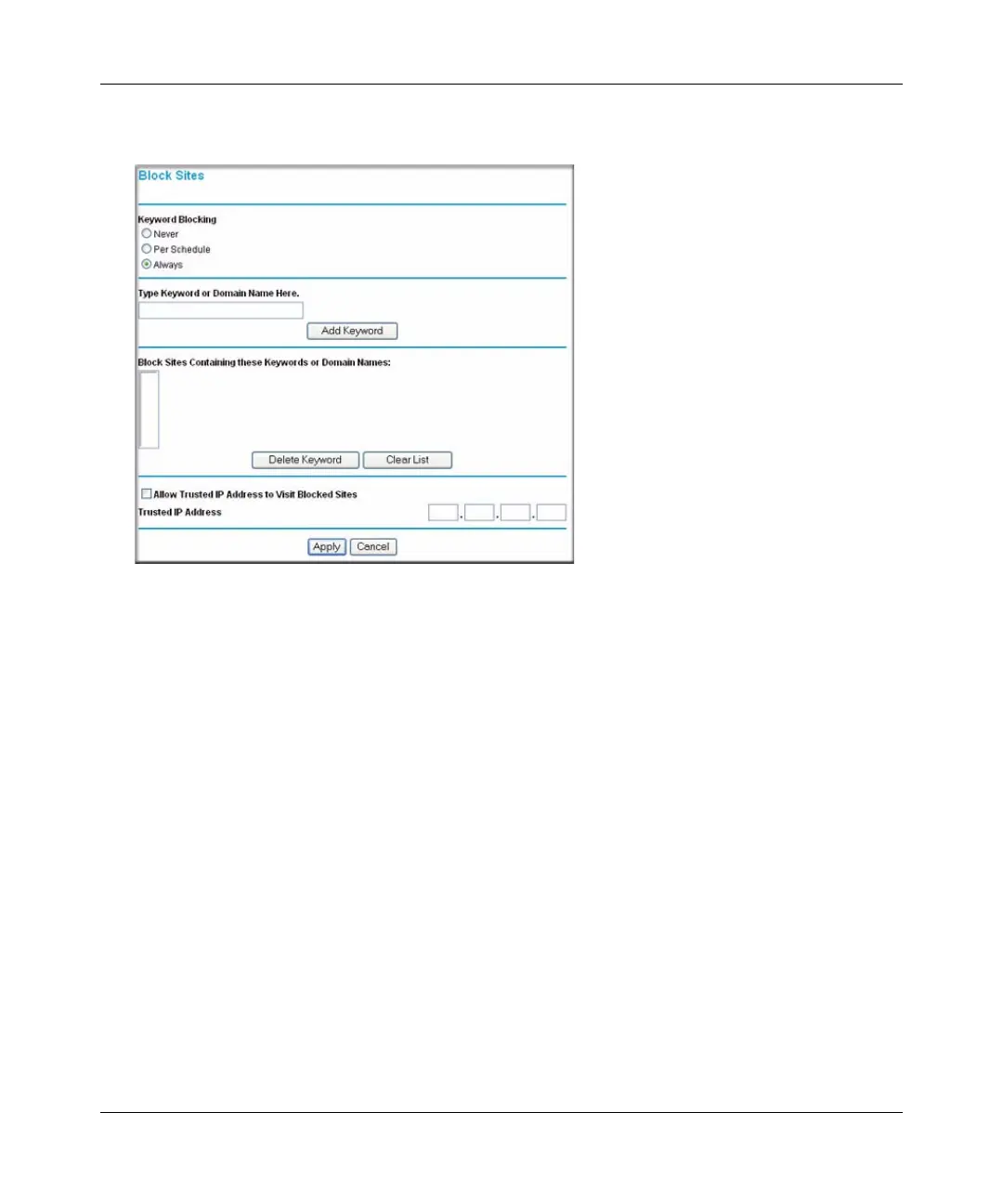 • Per Schedule. Turn on keyword blocking according to the settings in the Schedule screen.