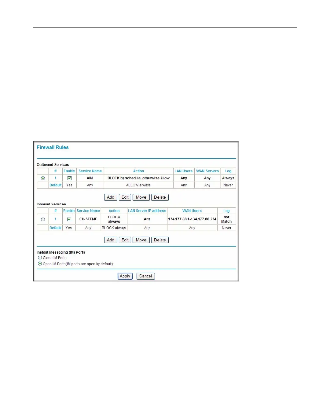As you define new rules, they are added to the tables in the Firewall Rules screen, as shown in the