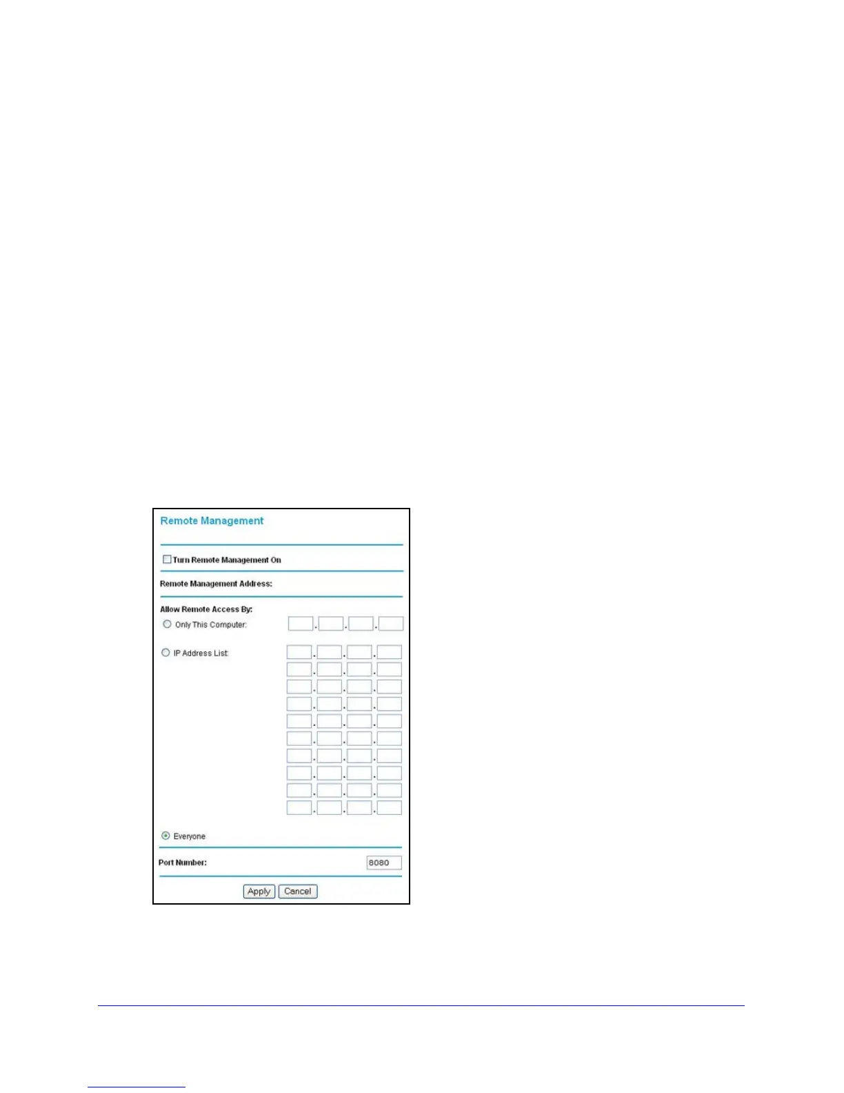The Remote Management screen lets you allow a user or users on the Internet to configure,