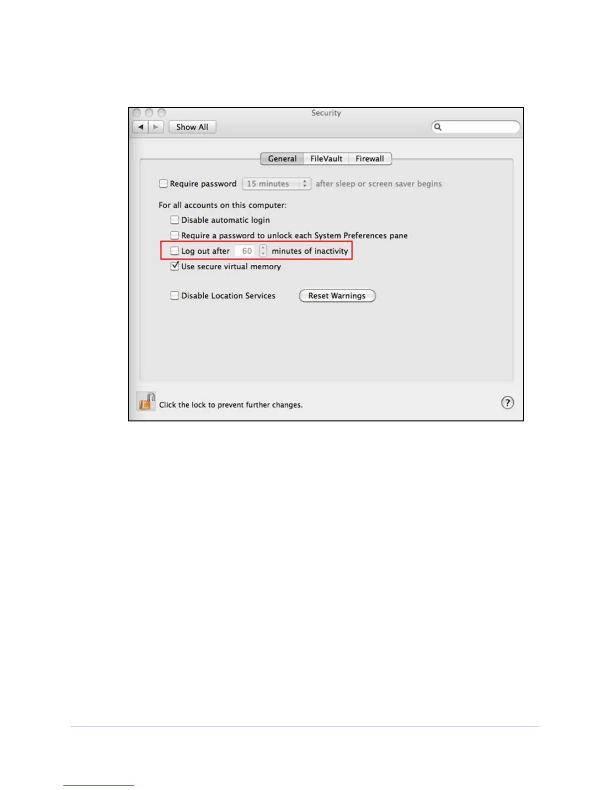 c. On the Security screen, leave the Log out after minutes of inactivity check box