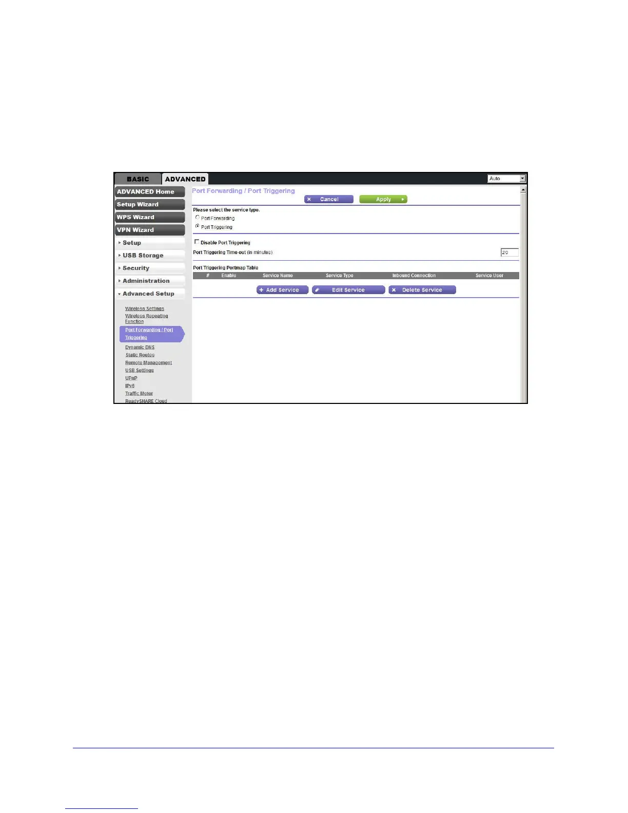 > Advanced Setup > Port Forwarding/Port Triggering.