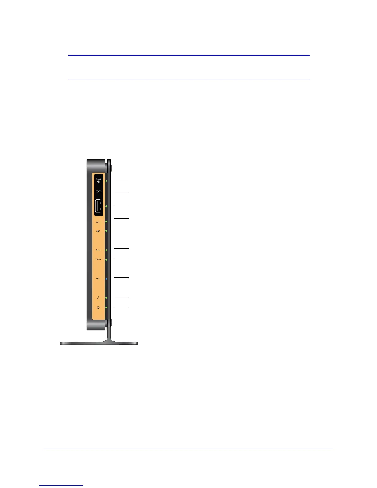 The wireless modem router front panel has the 10 status LEDs, icons, and ports shown in the