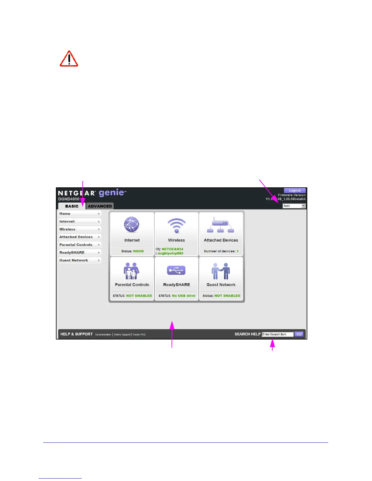 The wireless modem router BASIC Home screen has a dashboard that lets you see the