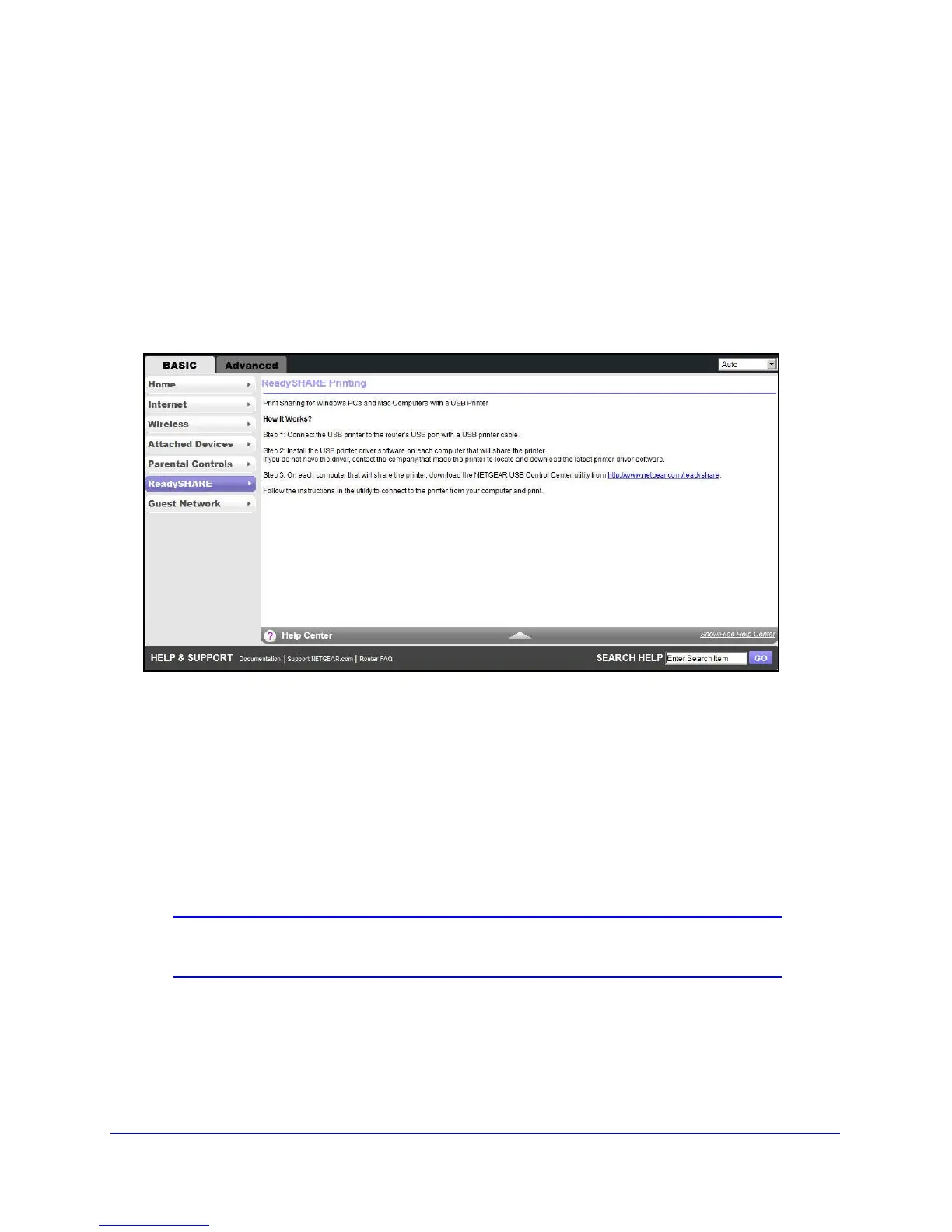 Settings) screen, select ReadySHARE Printer to display the following screen: