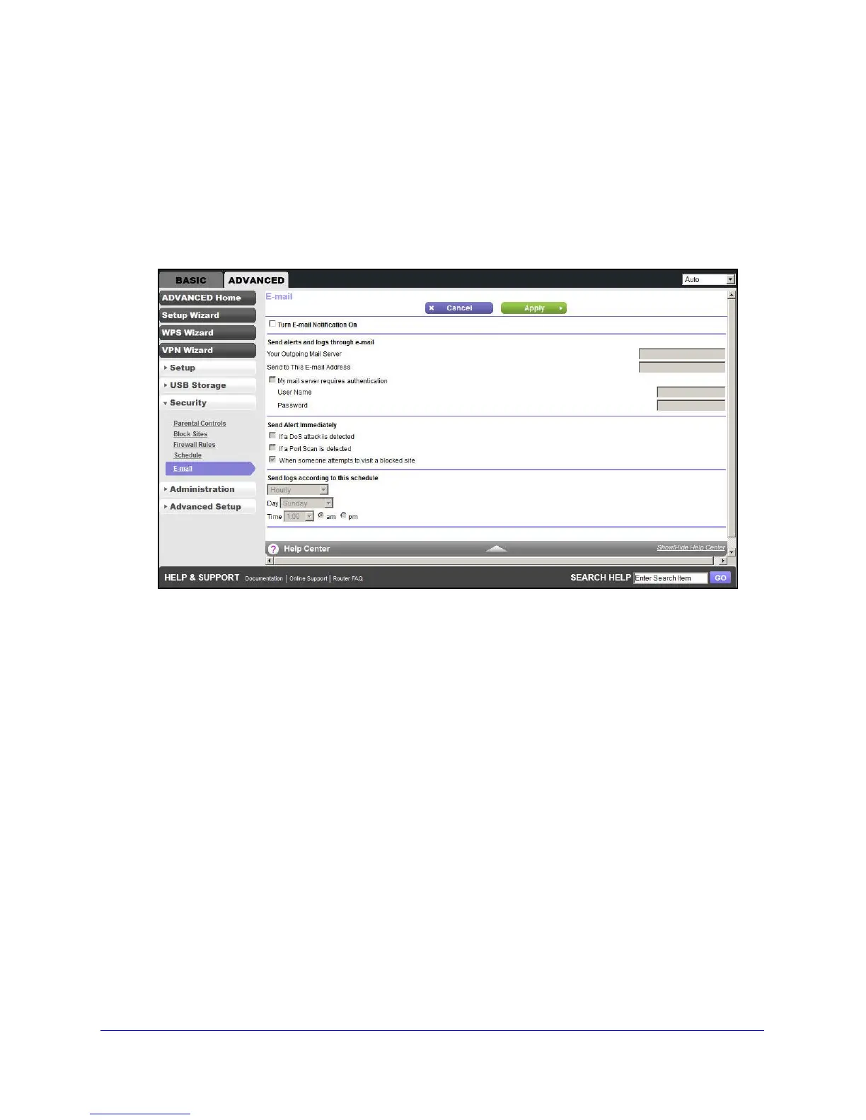 2. To receive email logs and alerts from the wireless modem router, select the Turn E-mail