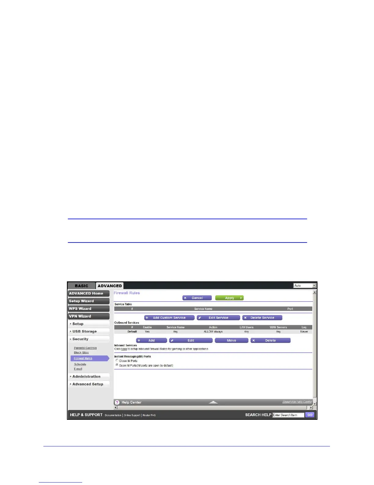 The Firewall Rules screen lets you block or allow specific Internet traffic services by