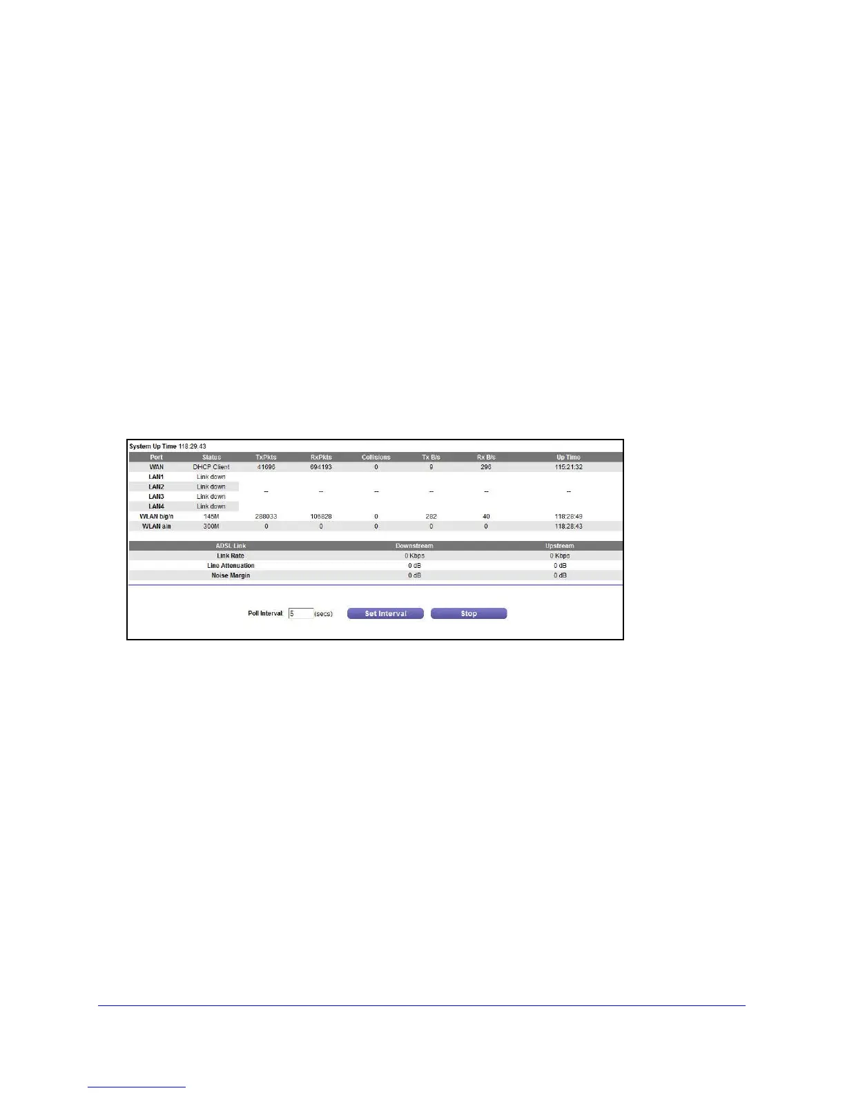 System Up Time. The time elapsed since the wireless modem router was last restarted.