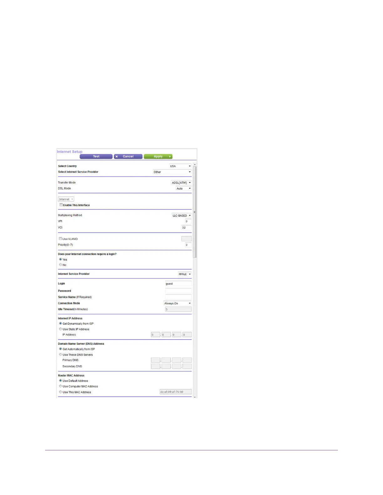The following figure shows the settings that display when you configure an ADSL connection with a