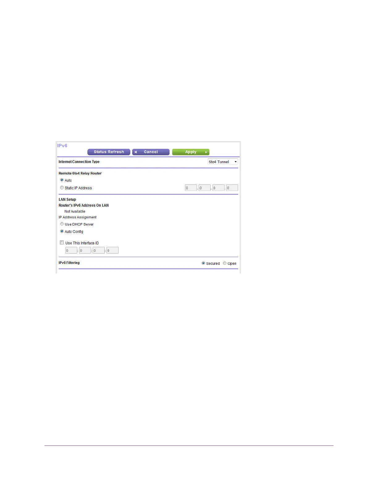 • Use DHCP Server. This method passes more information to LAN devices but some IPv6 systems