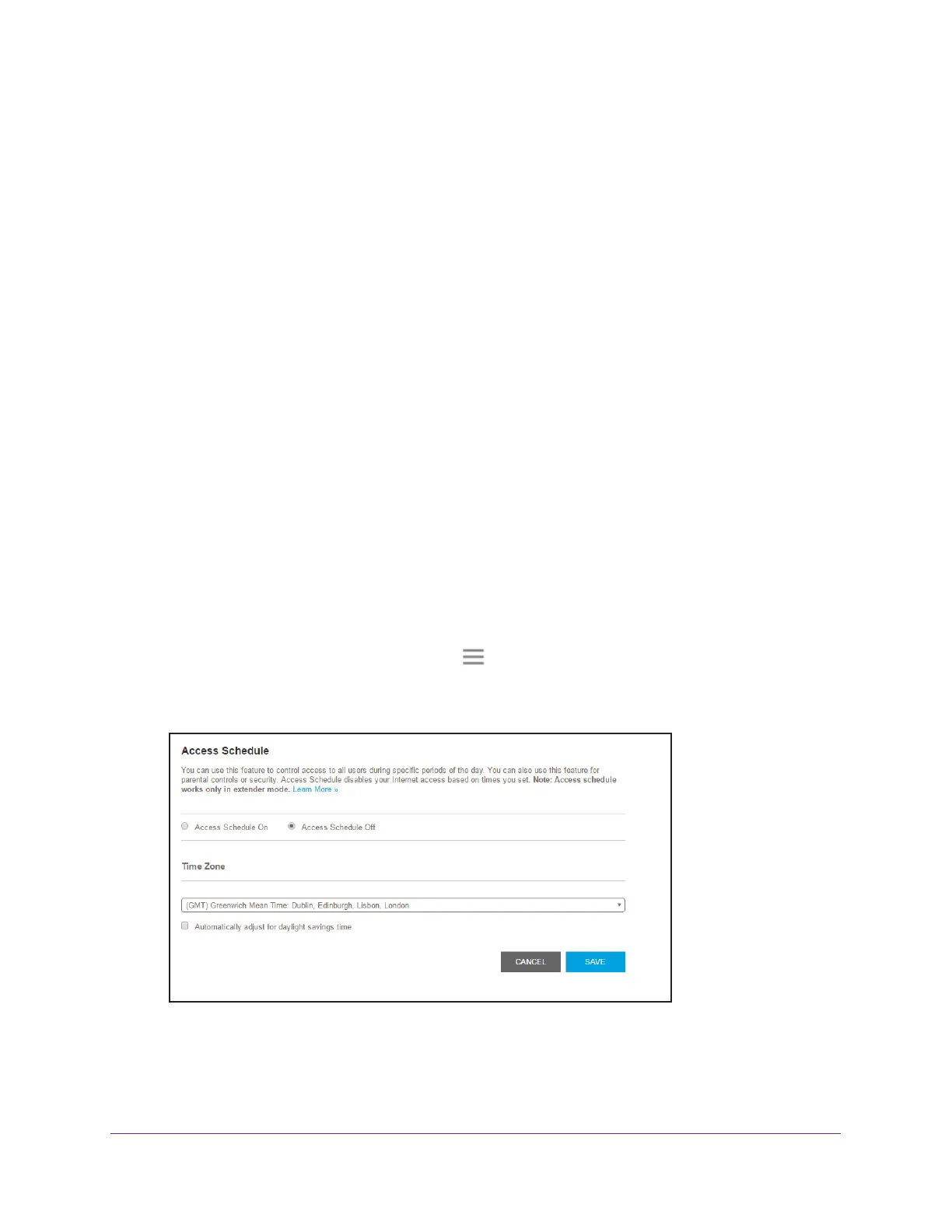 access schedule that prevents Internet access through the extender network based on the
