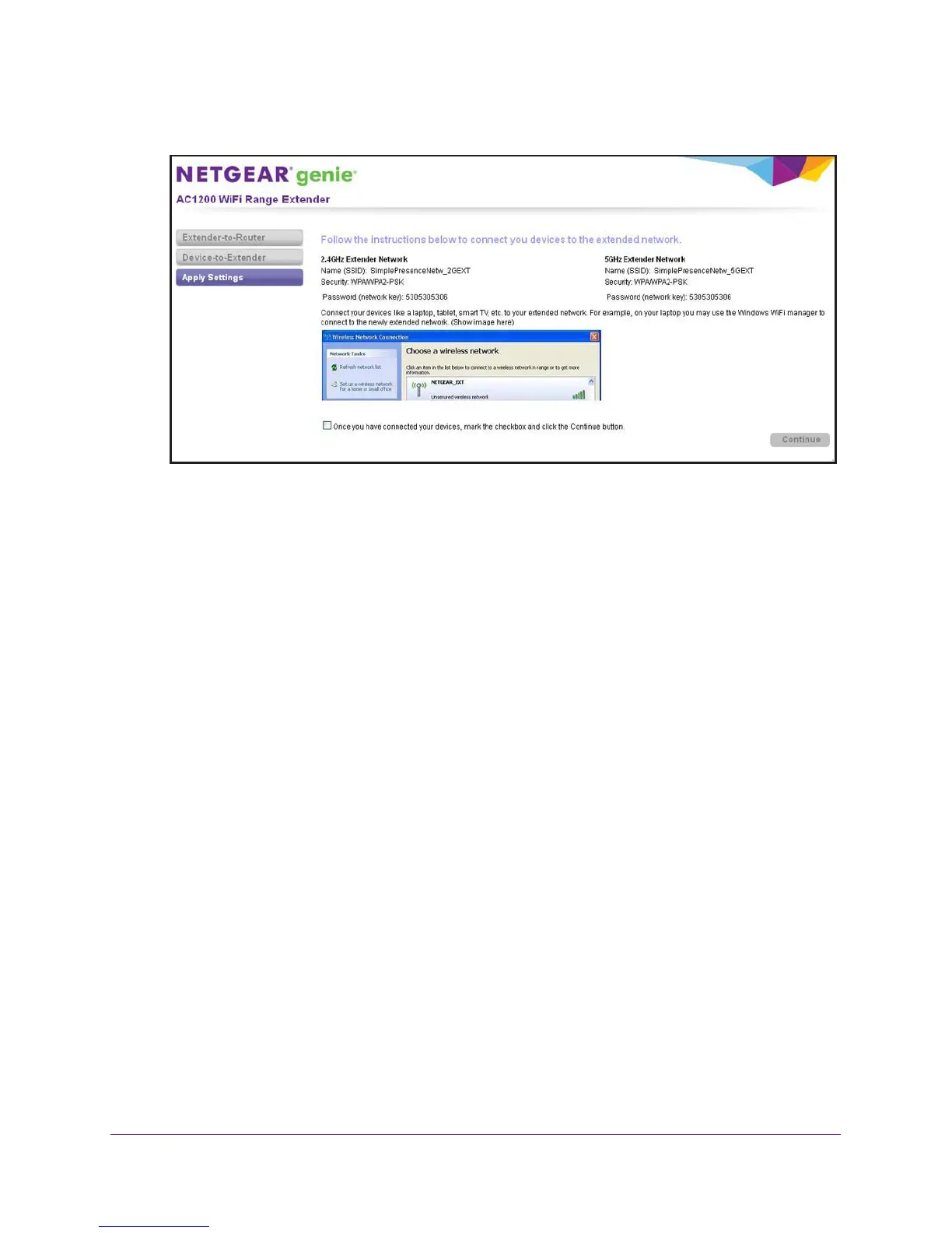 14. Select the My wireless devices are connected to the Extender network check box, and
