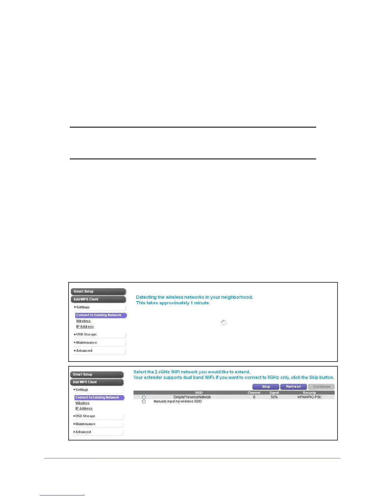The extender scans for existing WiFi networks and displays the networks in the 2.4 GHz