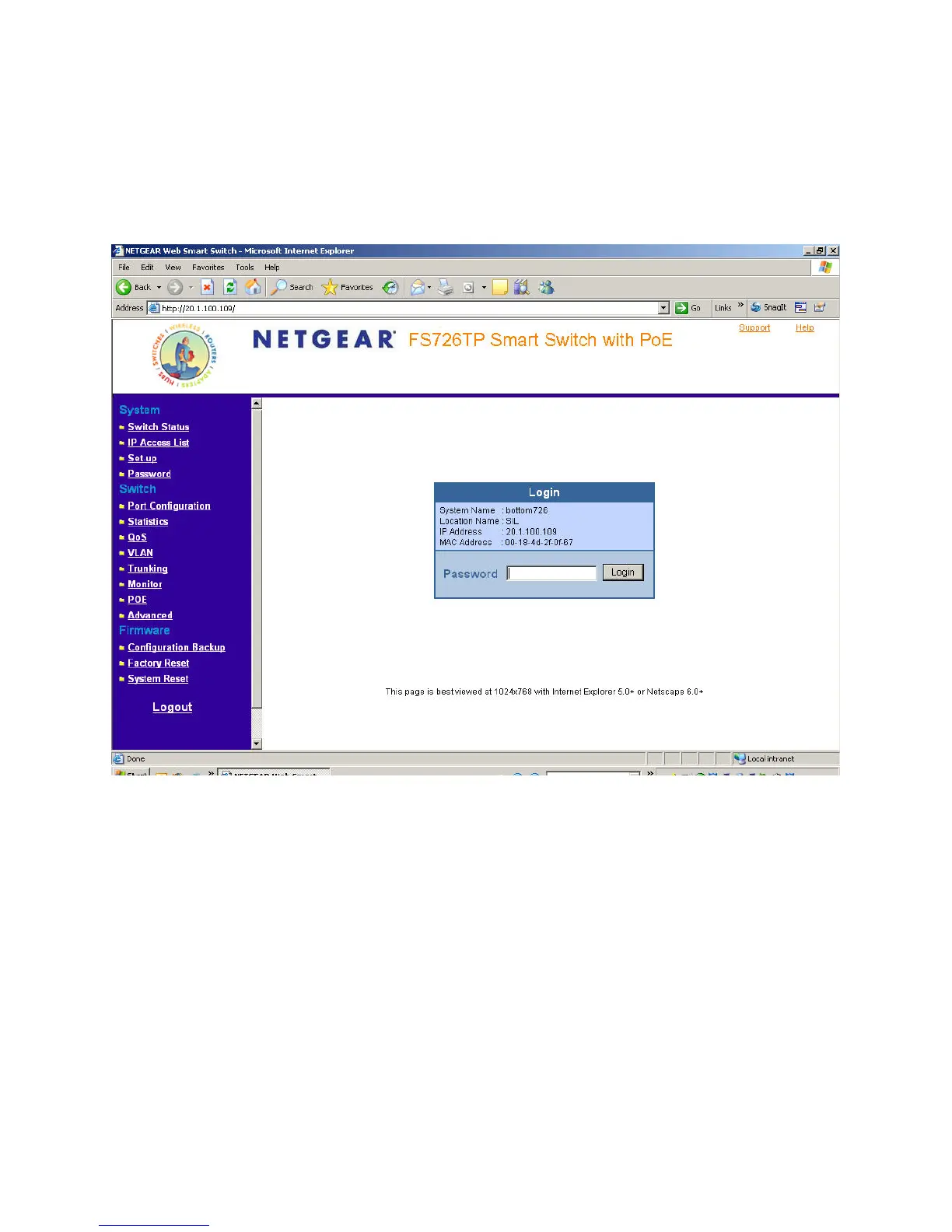 Using a Web Browser, enter the IP address of the NETGEAR FS726TP and open the NETGEAR