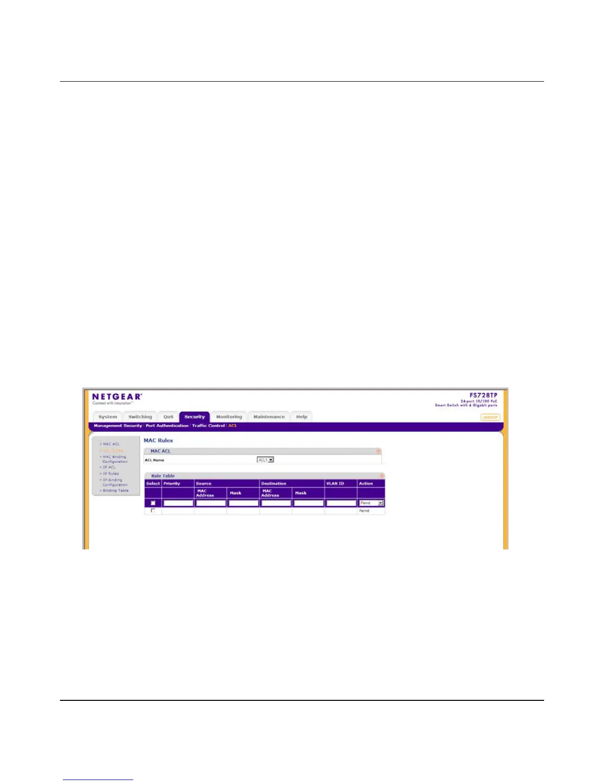 1. Click Security > ACL > MAC Rules. The MAC Rules screen displays: