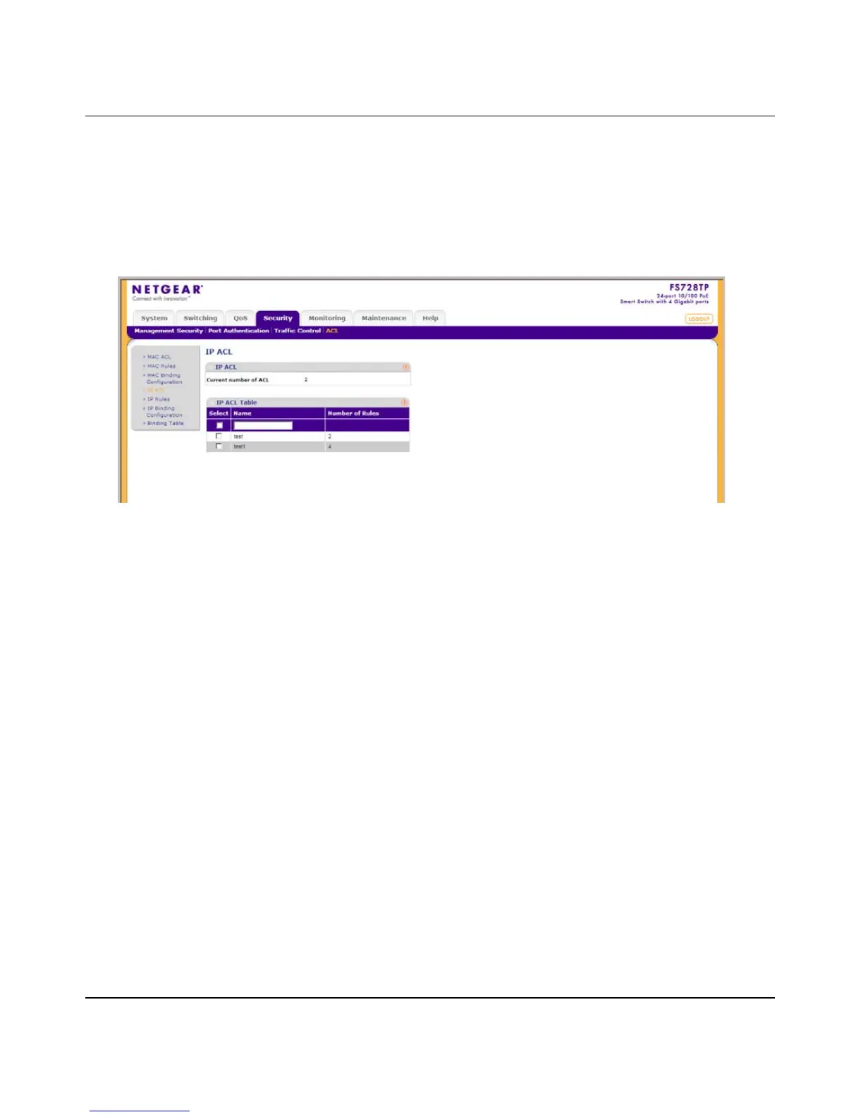 1. Click Security > ACL > IP ACL. The IP ACL screen displays: