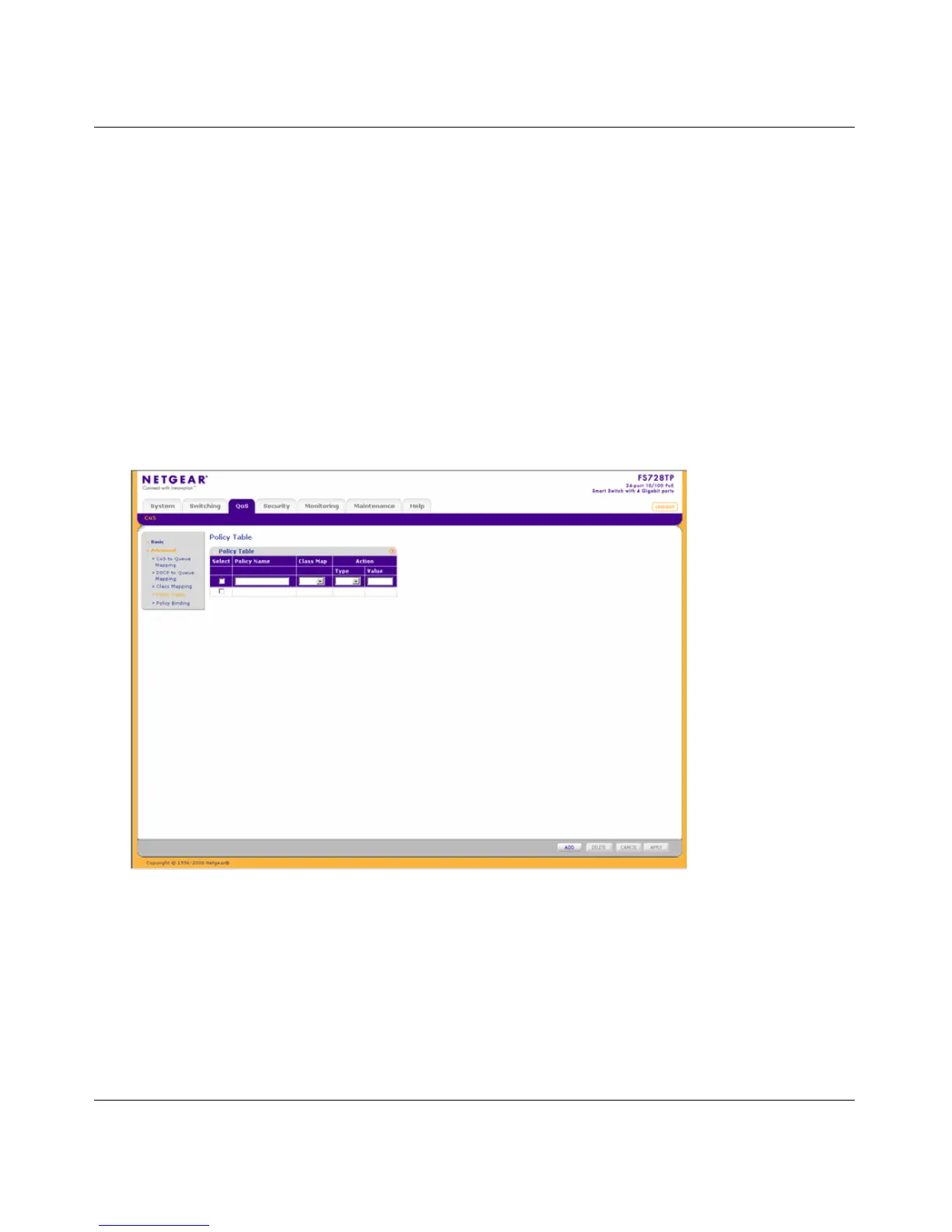 1. Click QoS > CoS> Advanced > Policy Table. The Policy Table screen displays: